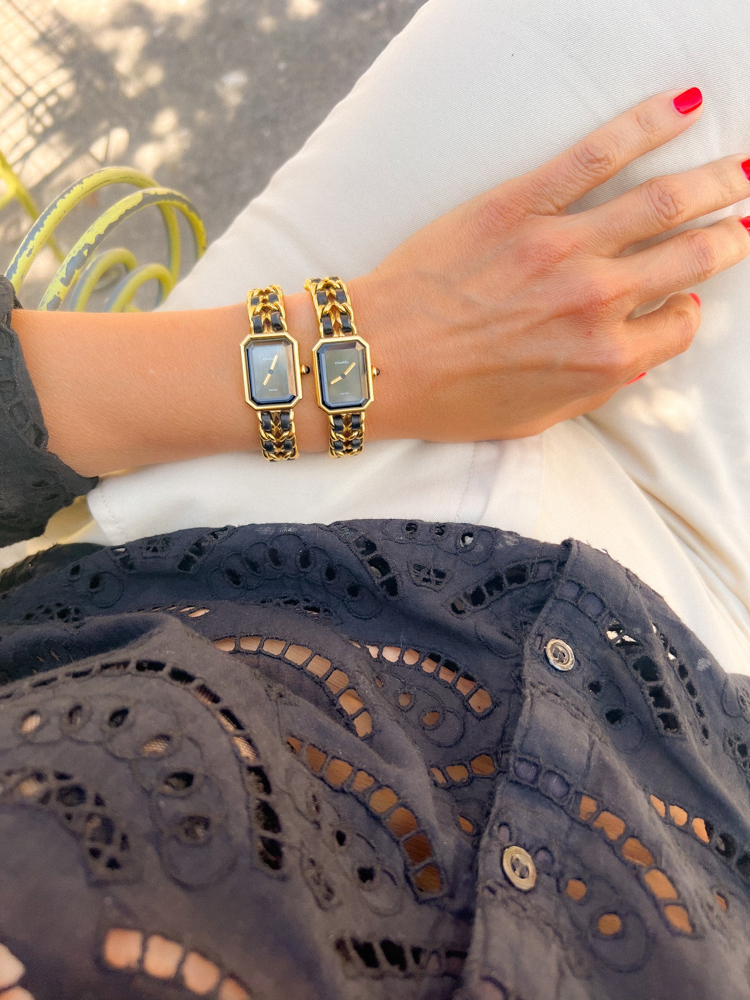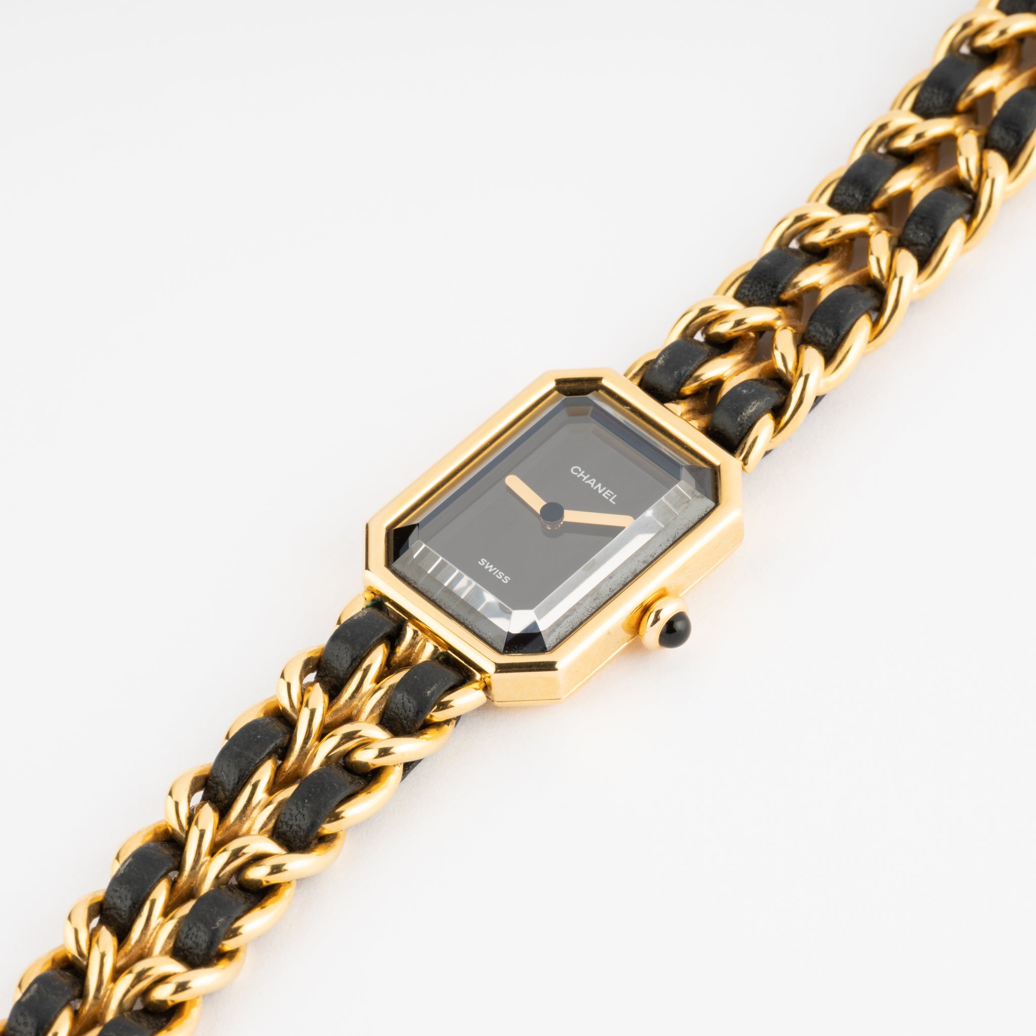 Montre bracelet Chanel Première taille L en plaqué or et cuir . Boitier octogonal en plaqué or avec verre facetté, couronne sertie d'un cabochon noir.