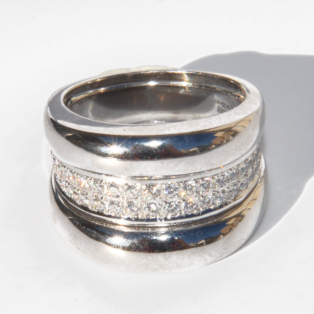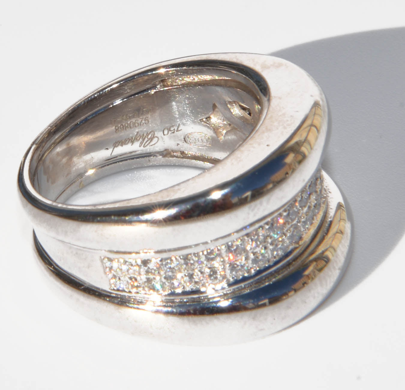 Une bague bandeau signée Chopard, modèle Strada, en or gris sertie d’une double ligne de 42 diamants taille brillant entre 2 godrons.