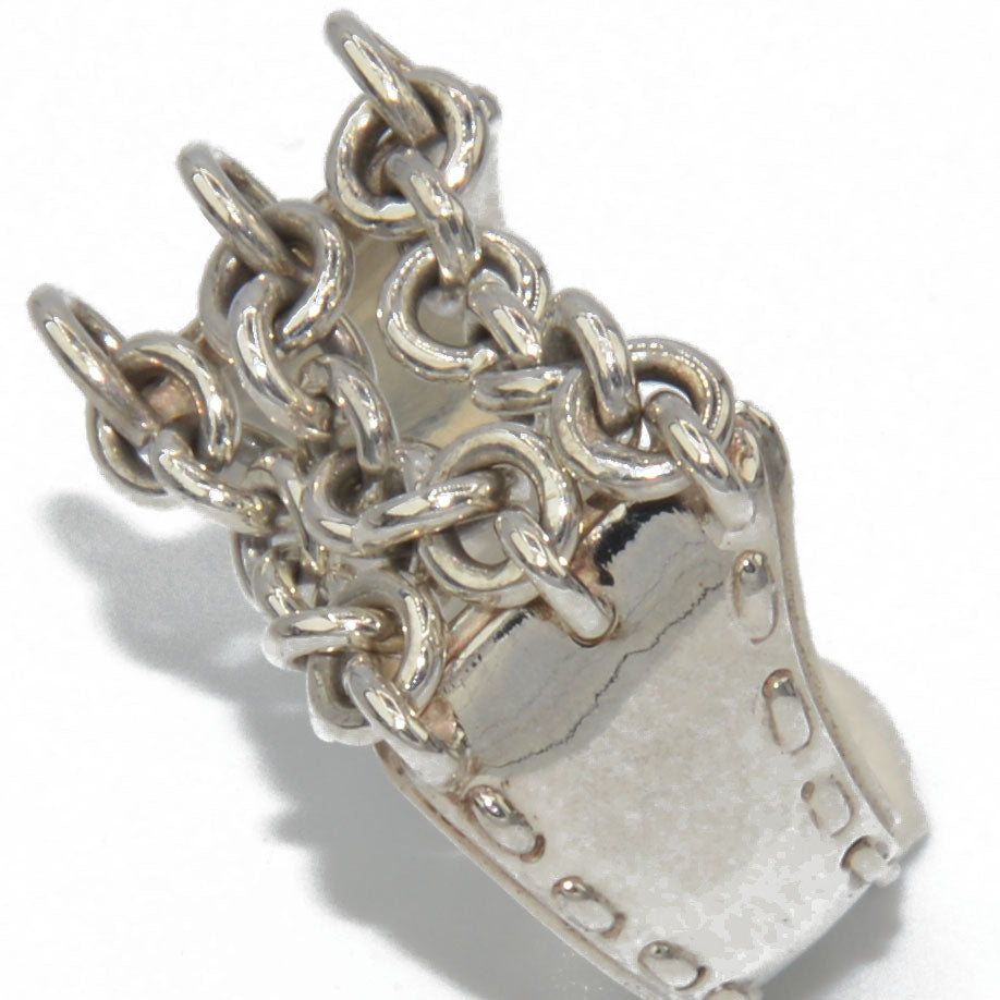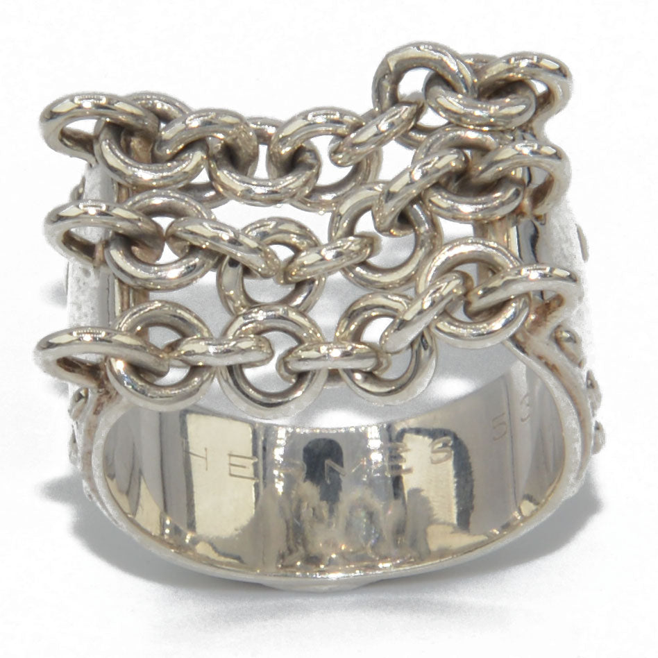 Bague en argent de la maison Hermès à motifs de 3 chaînettes sur un anneau plat ciselé sur les 2 côtés.