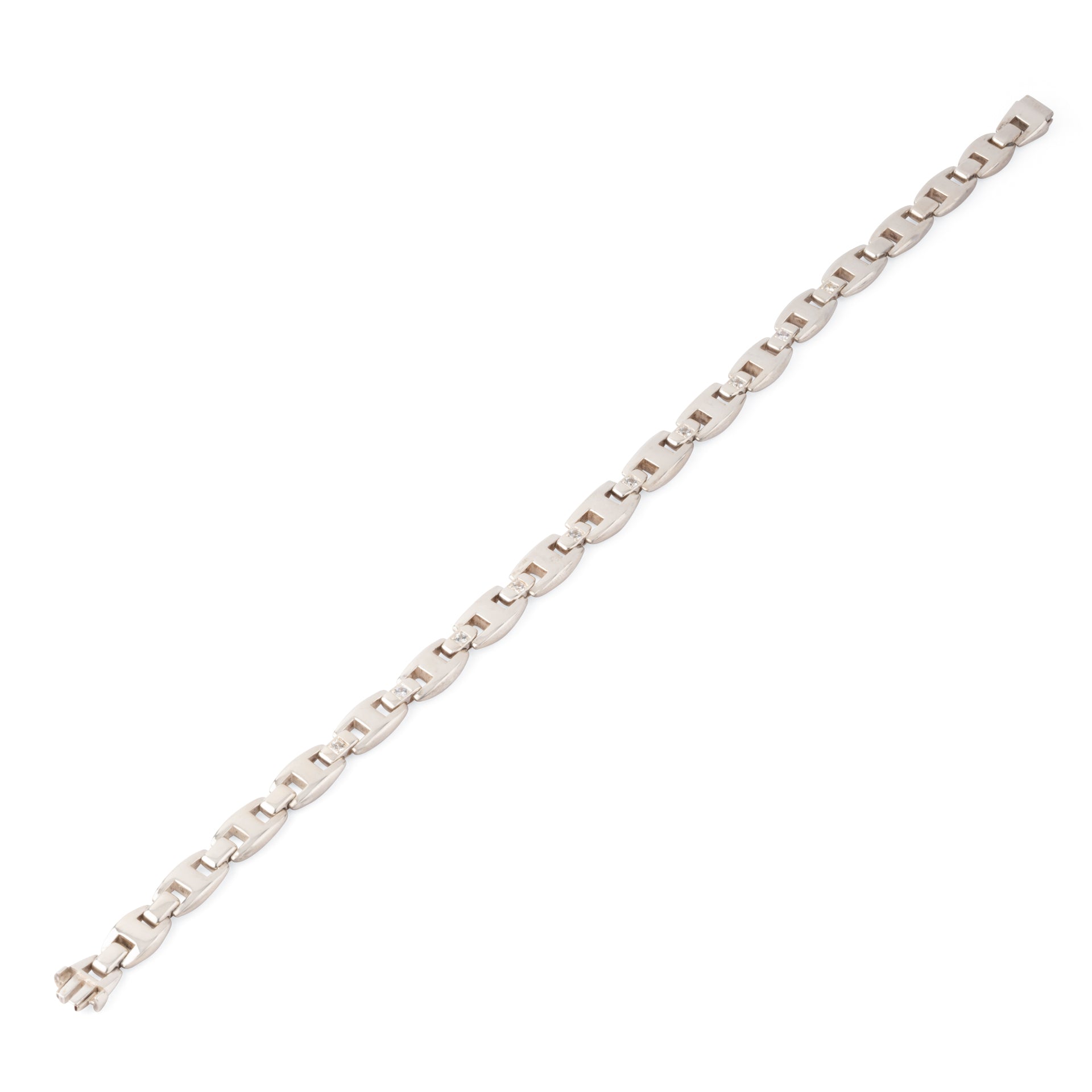 Collier de la maison Hermès, modèle Cassiopée en argent, alliant une chaîne d'ancre stylisée et des maillons rectangulaires. Ces derniers sont ornés de saphirs blancs ronds facettés, sublimés par un serti grain. Fermoir à cliquet.