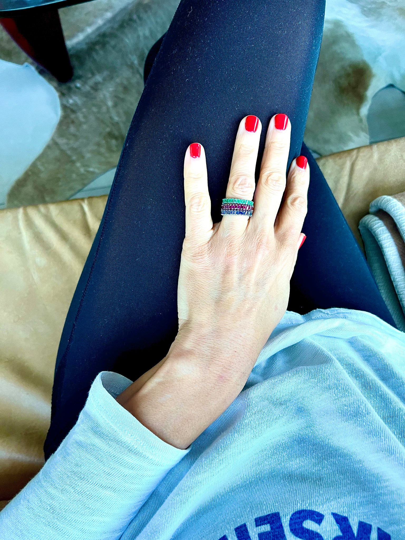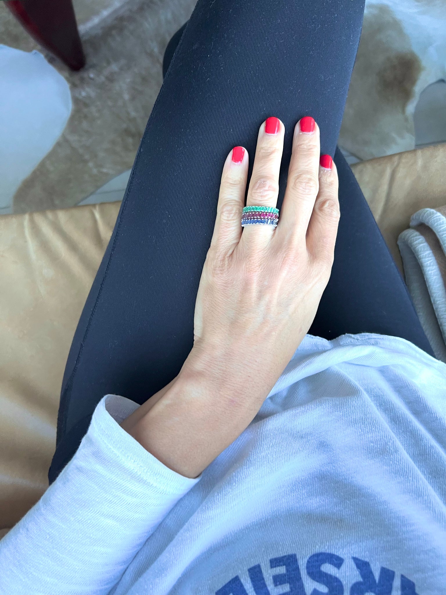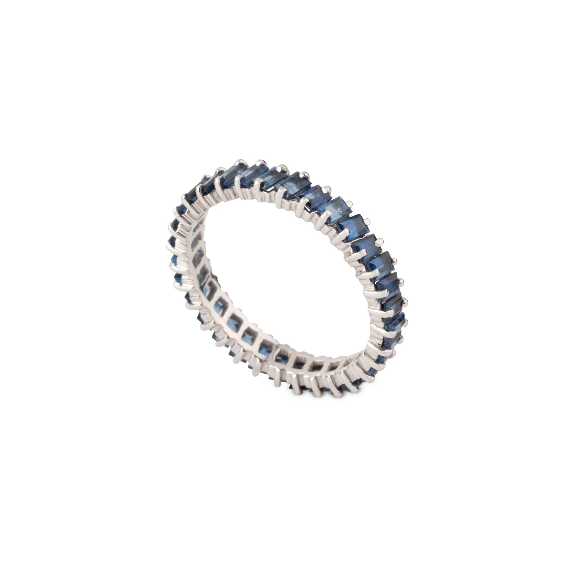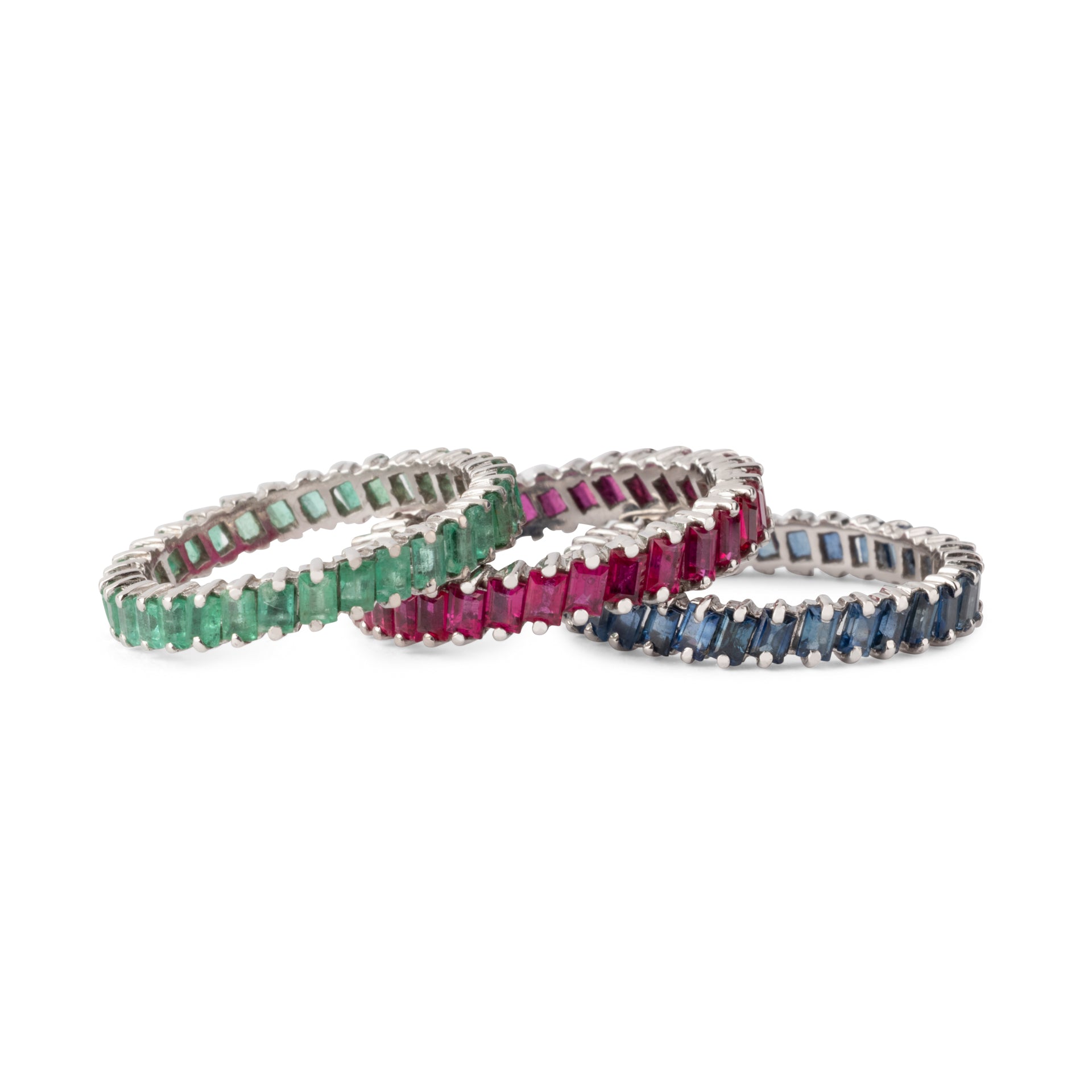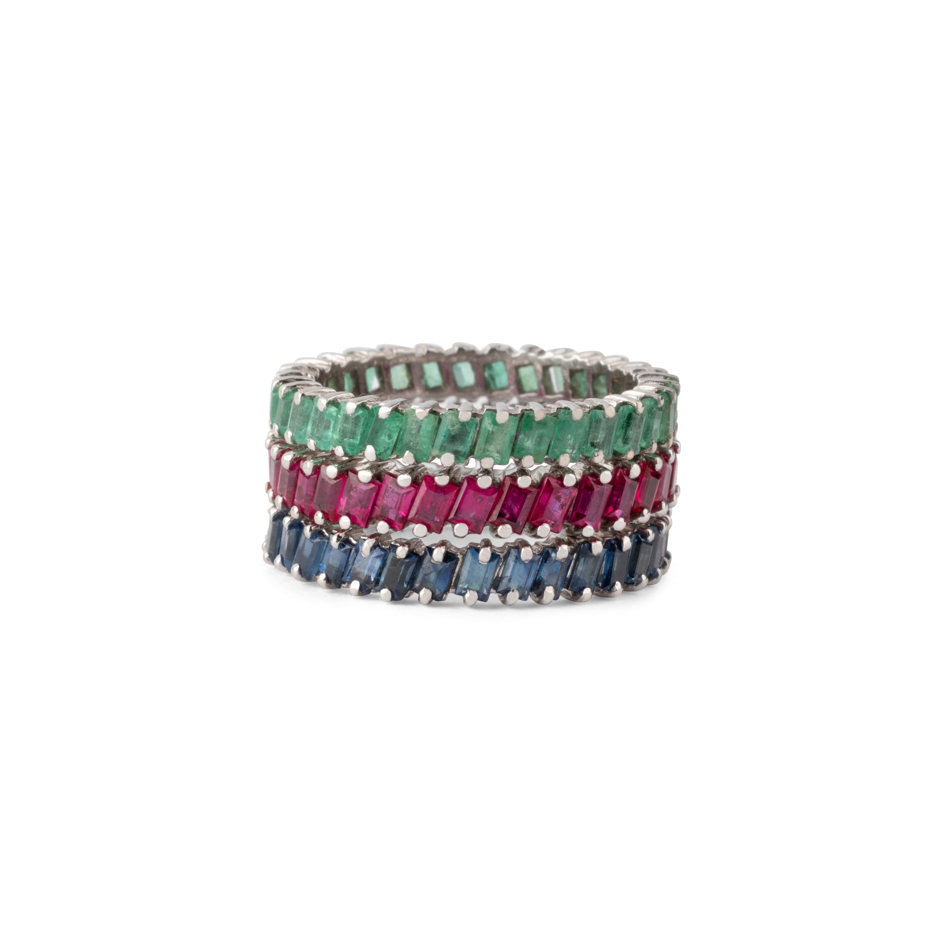 Alliances Américaine en or gris 18k ornées 33 émeraude, saphir et rubis taille baguette.