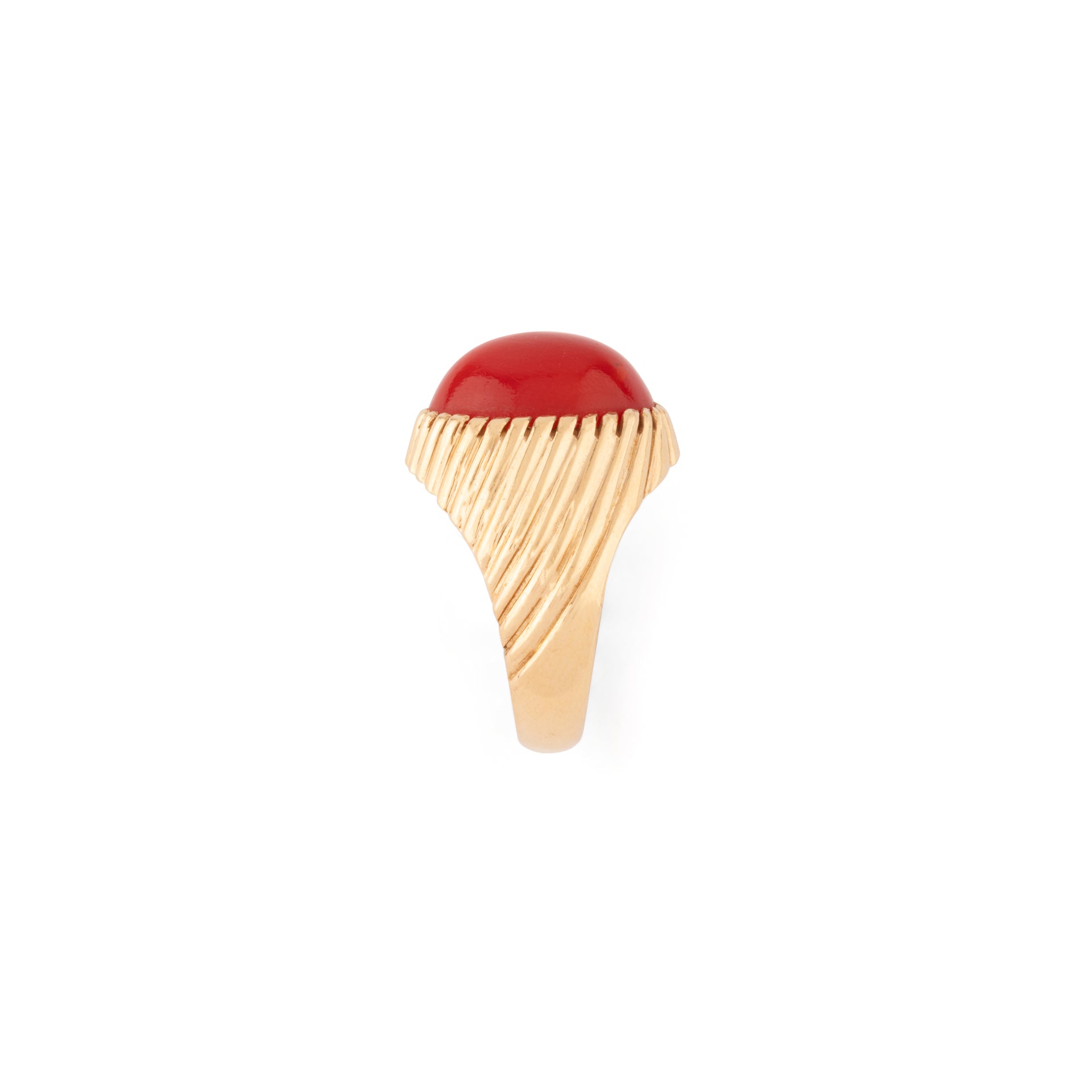 Bague chevalière ornée d'un cabochon de corail sur un large anneau or jaune godronné.