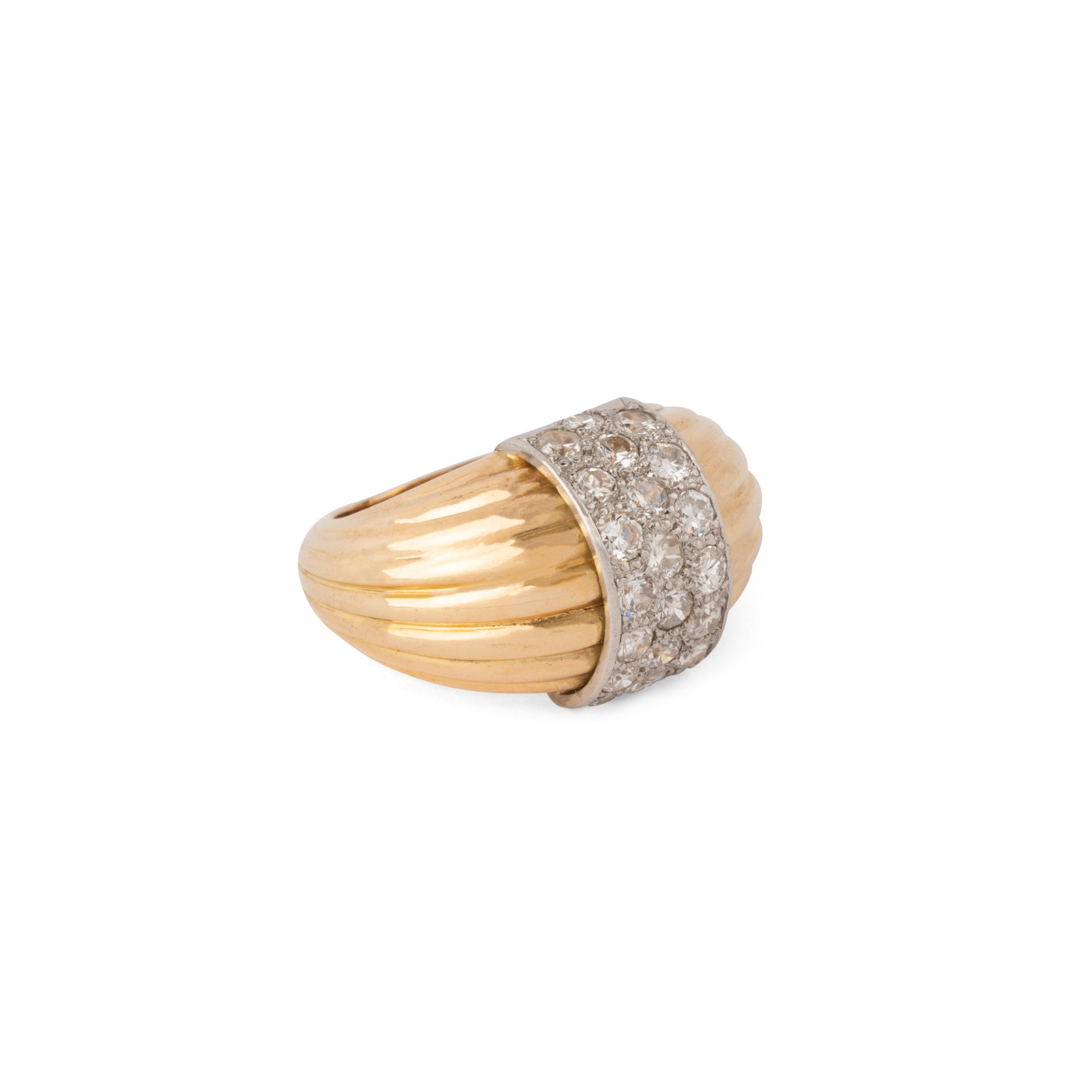 Bague or jaune et platine des années 1950 ornée d'une bande de diamant sur platine sur un jonc godronnée.