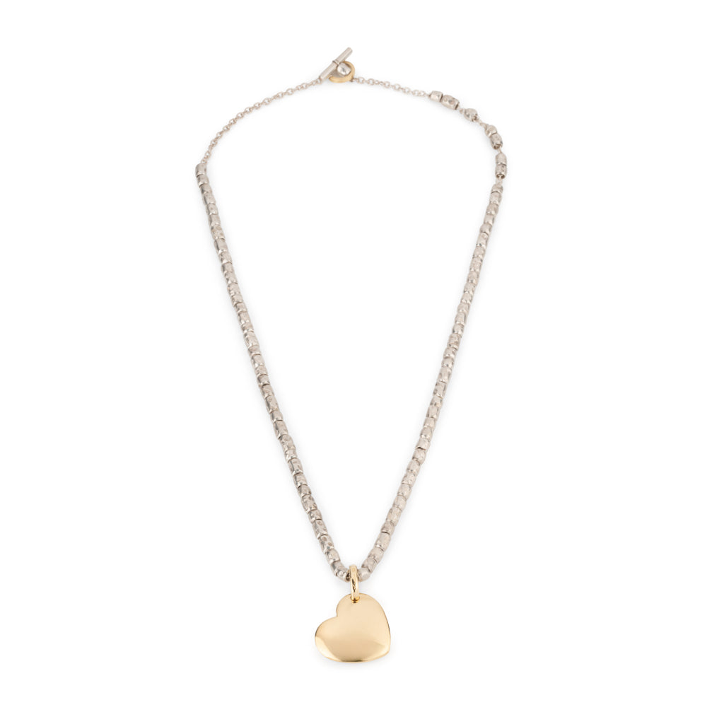 Collier en argent sur une chaine argent et une succession de petits motifs en argent,finissant par un cœur penché en or.