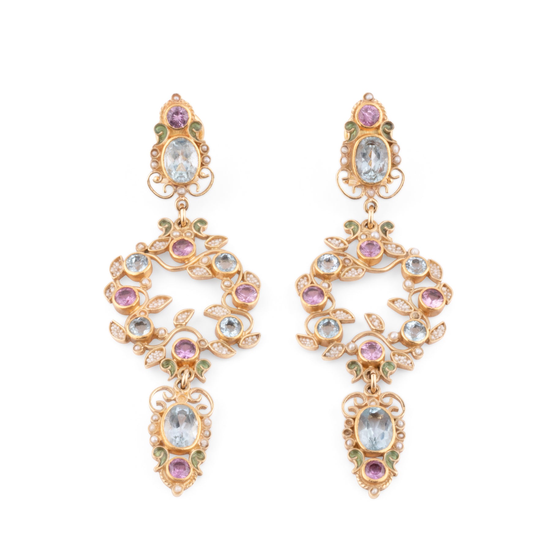 Longue paire de boucles d'oreilles or jaune 18k forme arabesque ornée de perles fines aigues -marines, saphirs roses et émail vert signée de Papi Percossi créateur romain.