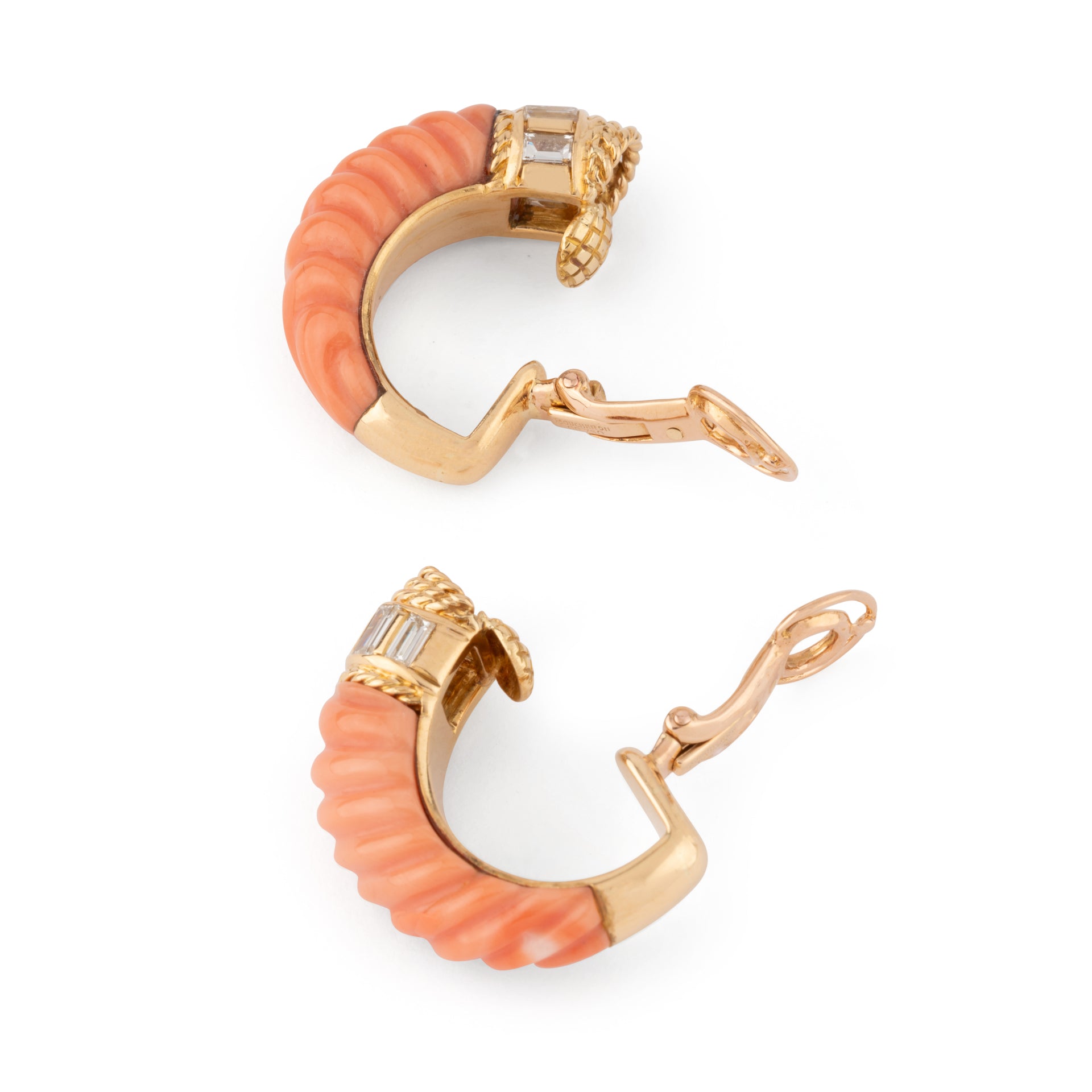 Paire de boucles d'oreille en or jaune, de la maison Boucheron formant une demie créole en corail godronné surligné d'une rangée de diamant taille baguette.