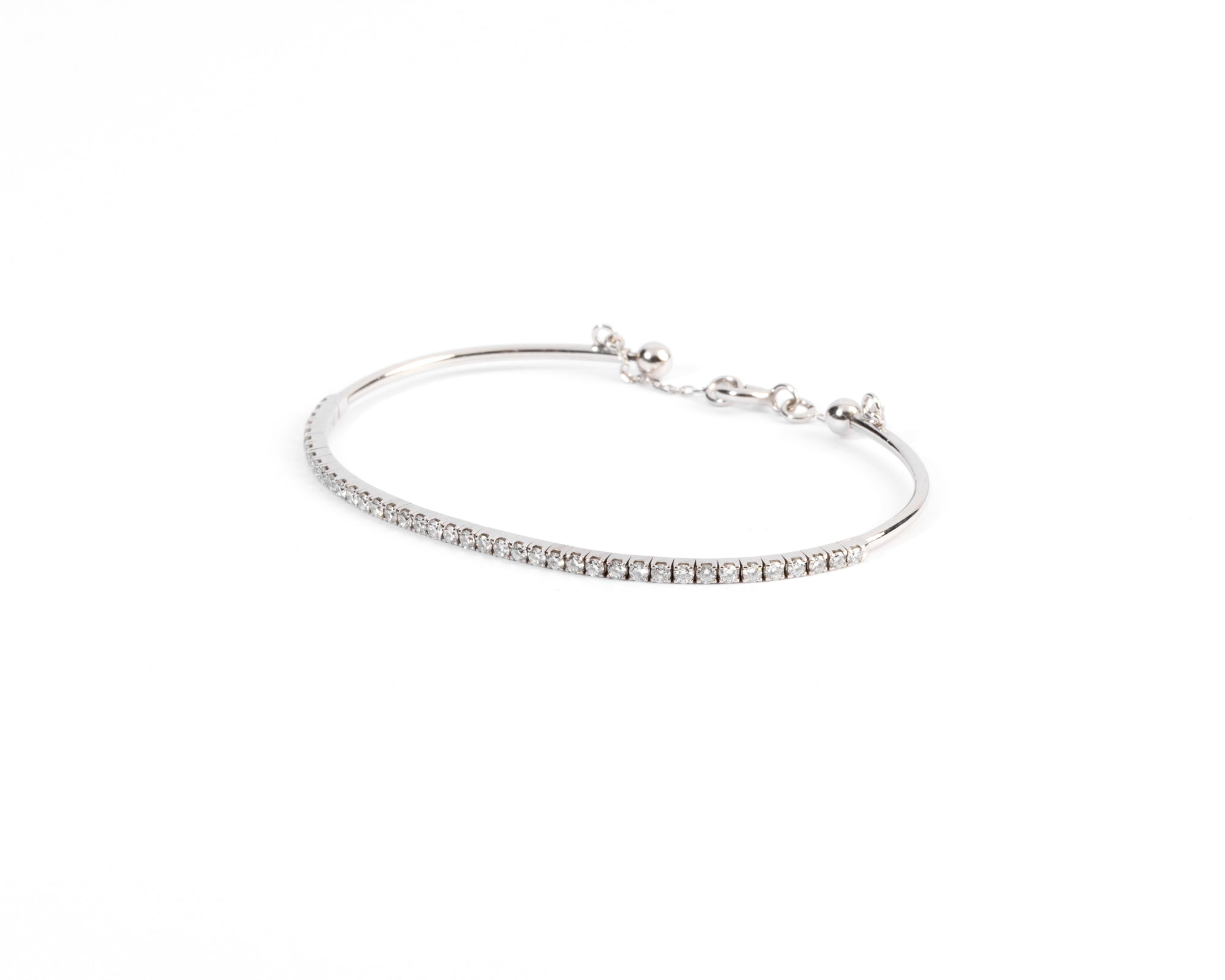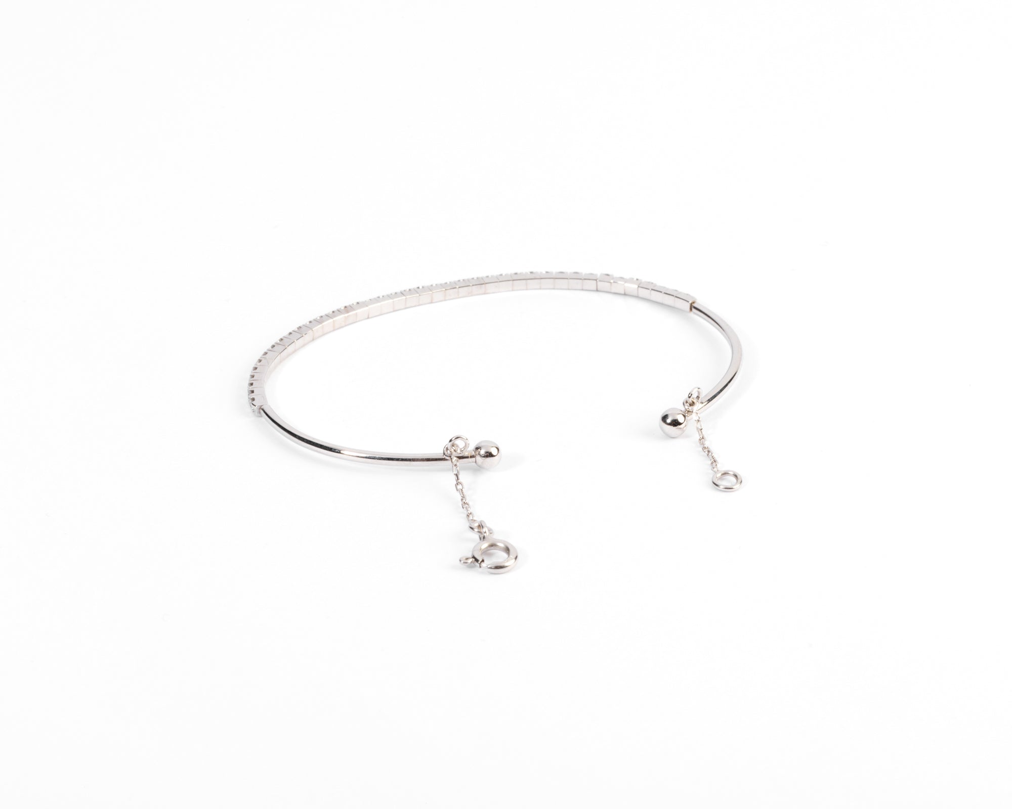 Bracelet demi jonc or gris et diamant sur le dessus avec chainette de sécurité.