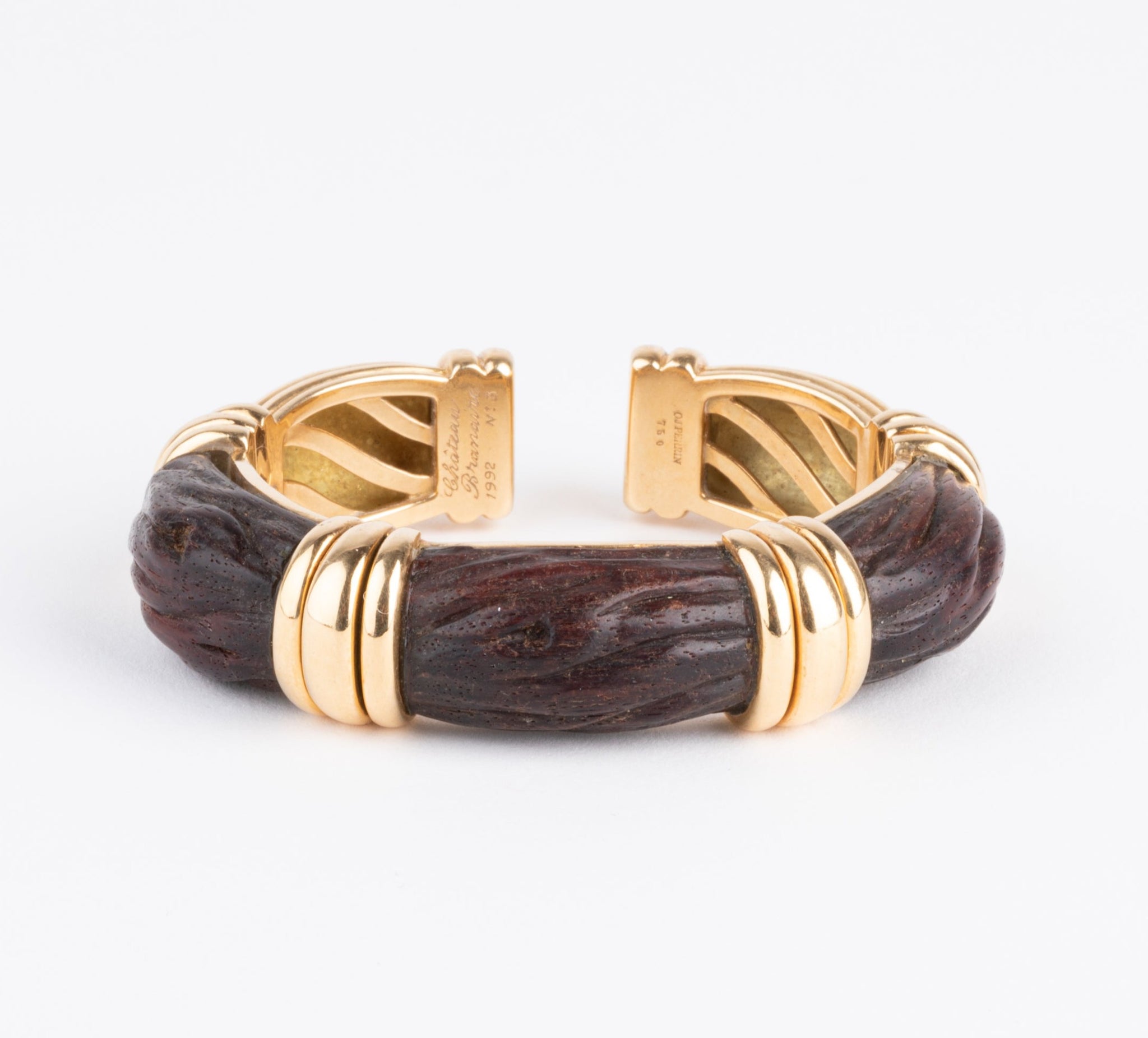 Bracelet jonc OJ Perrin en or jaune et bois d'amourette sculpté et or jaune godronné.