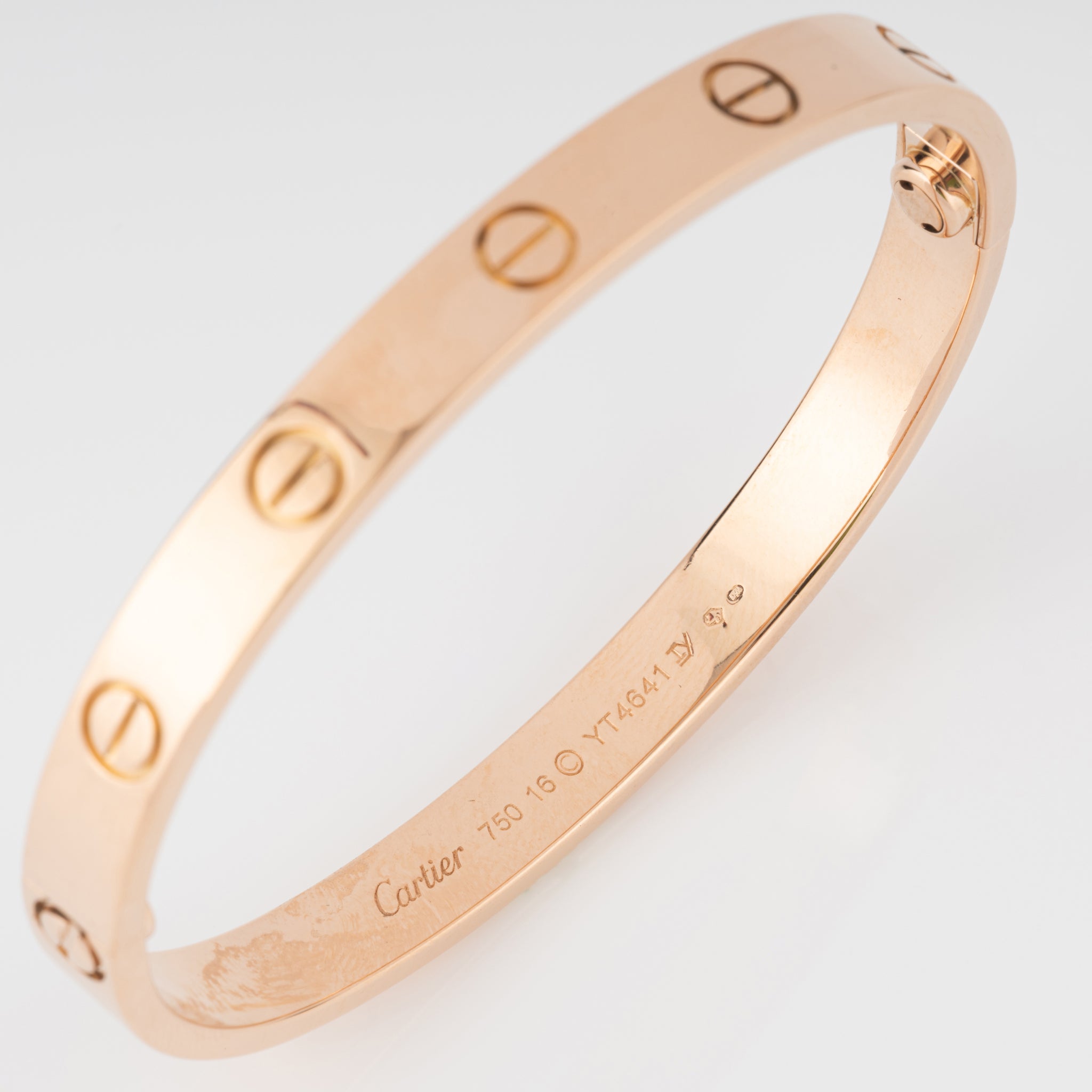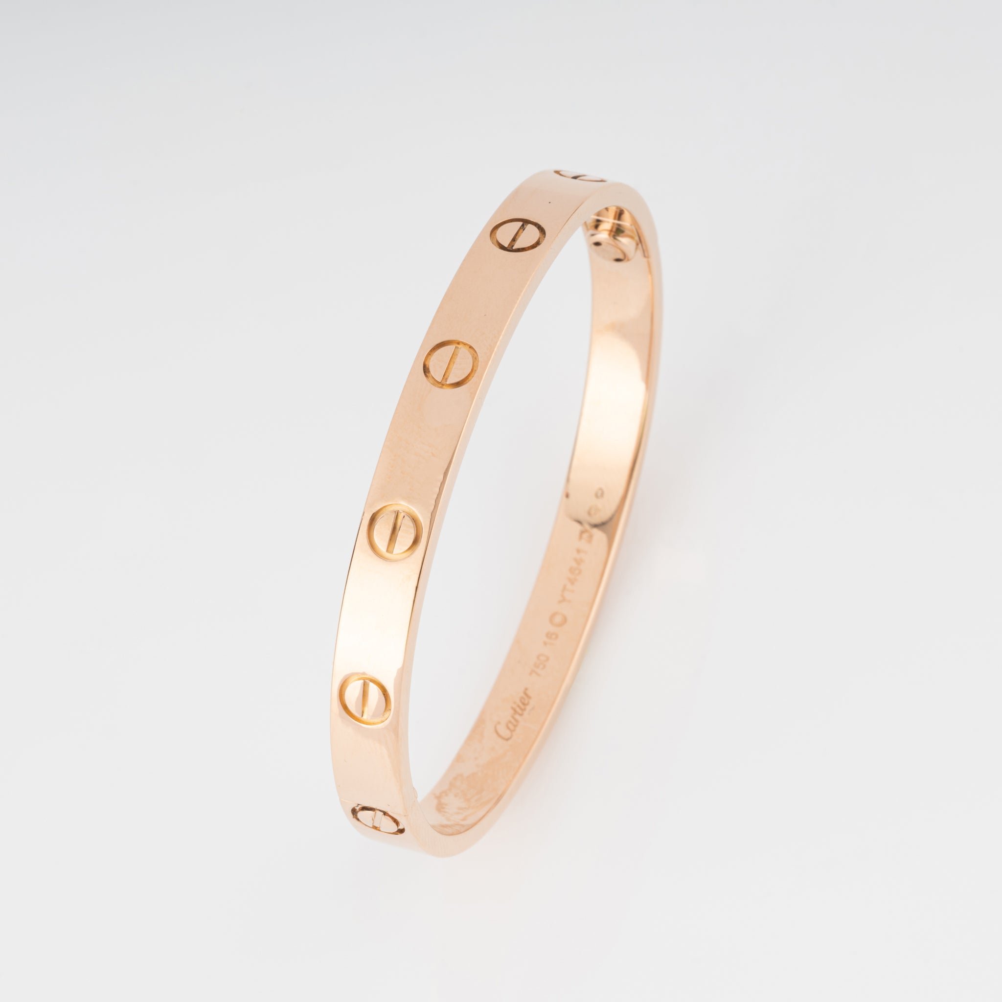 Bracelet Cartier Love grand modèle en or rose , composé d'un élégant bandeau lisse, orné de motifs de vis gravés Taille 16