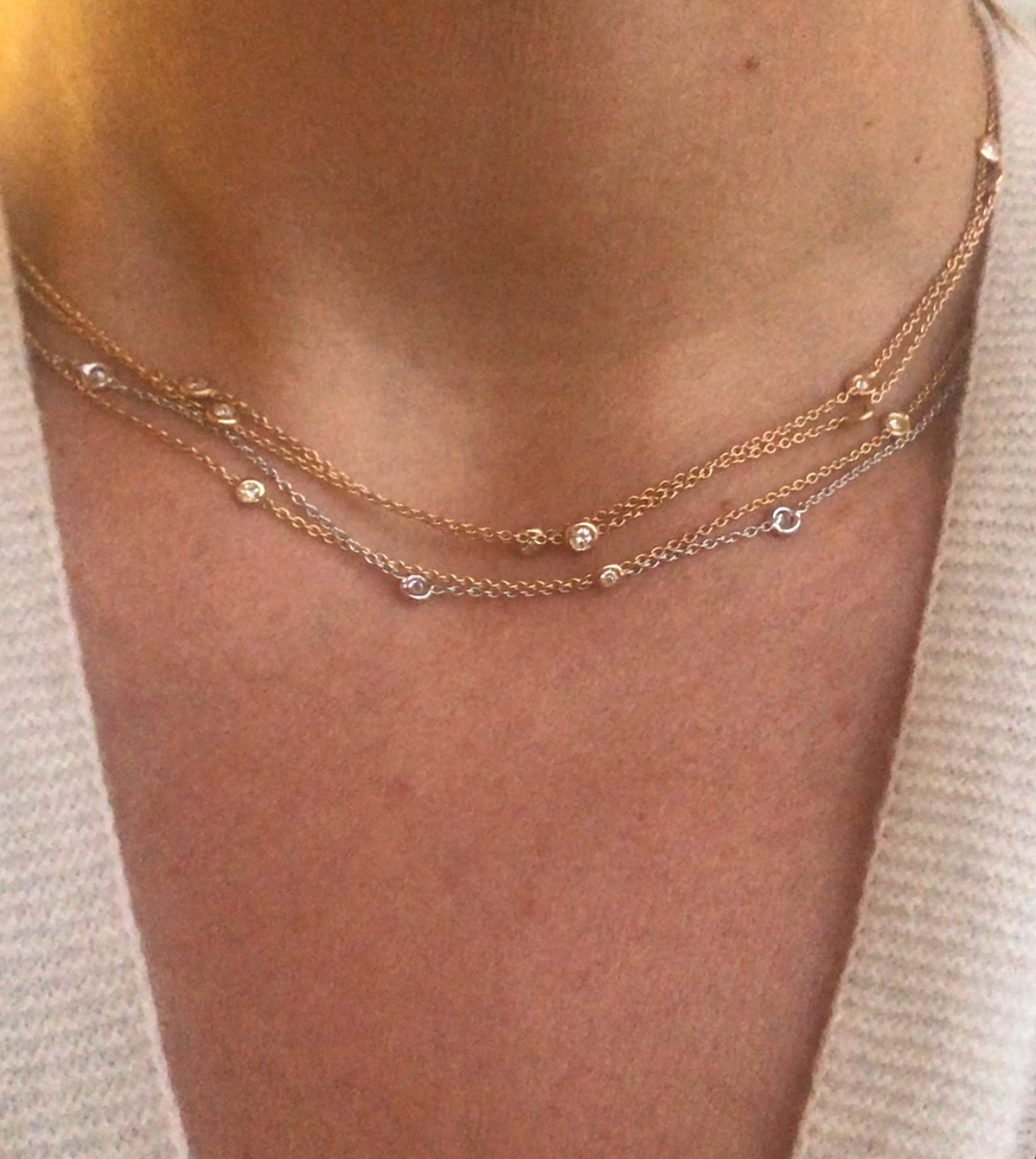 Collier or rose intercalé de 9 diamants sur maille forçat en sertis clos.