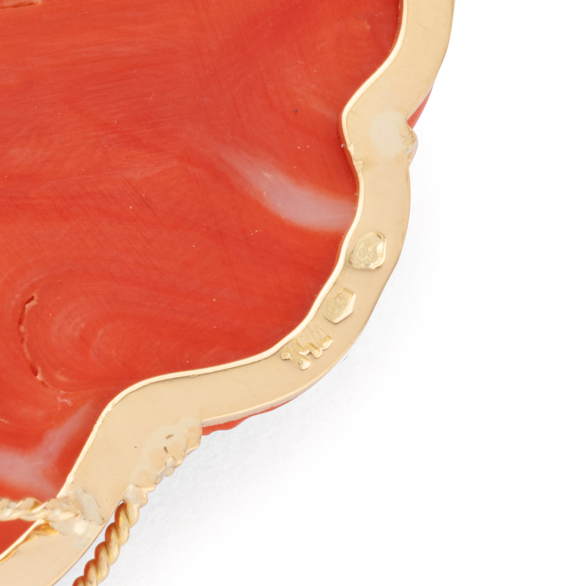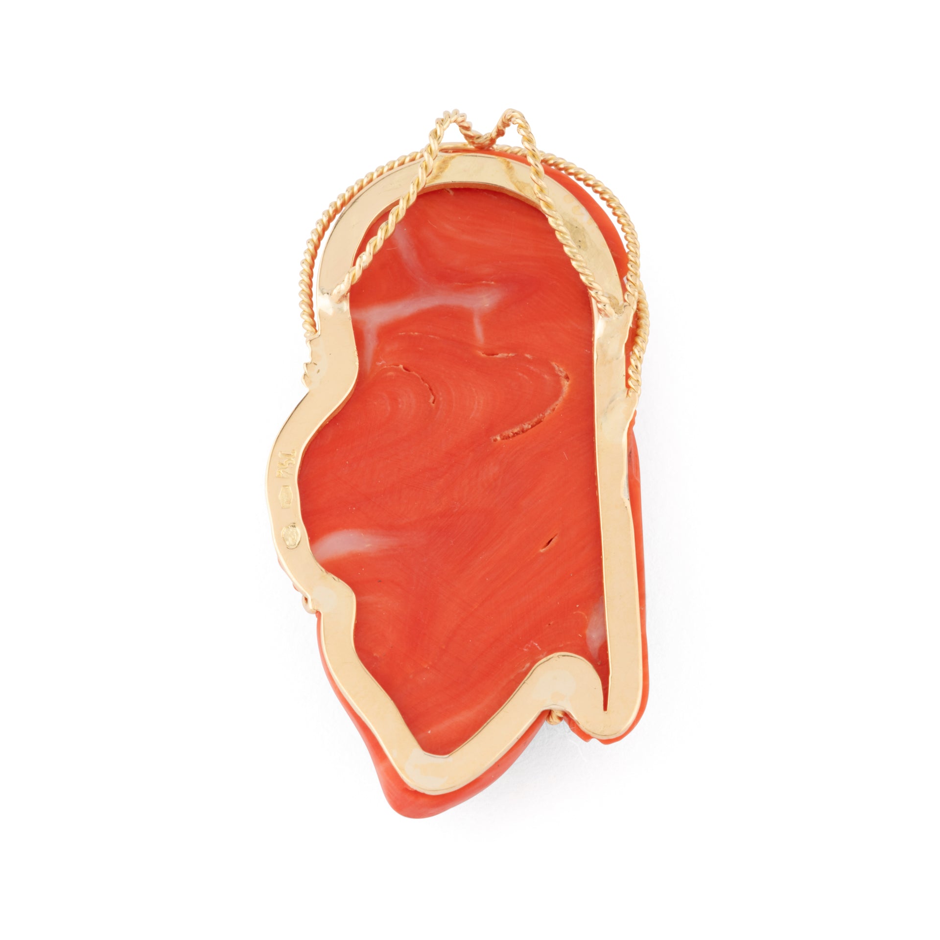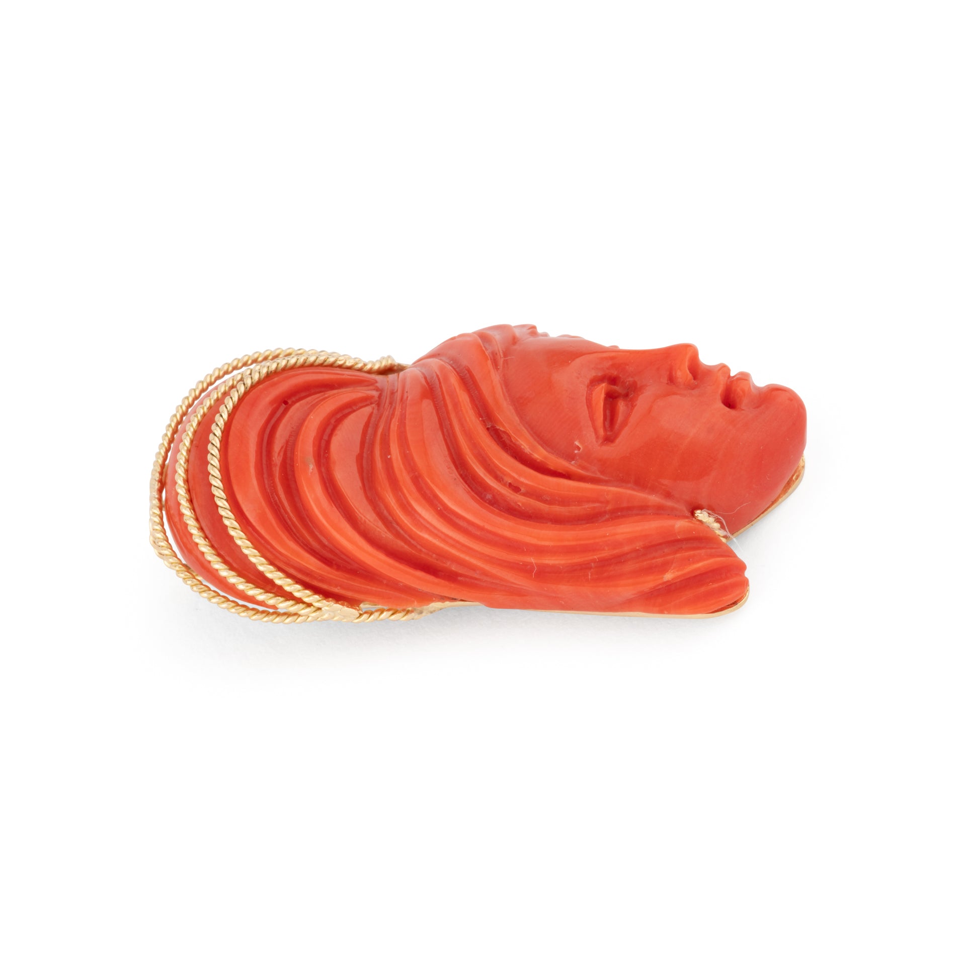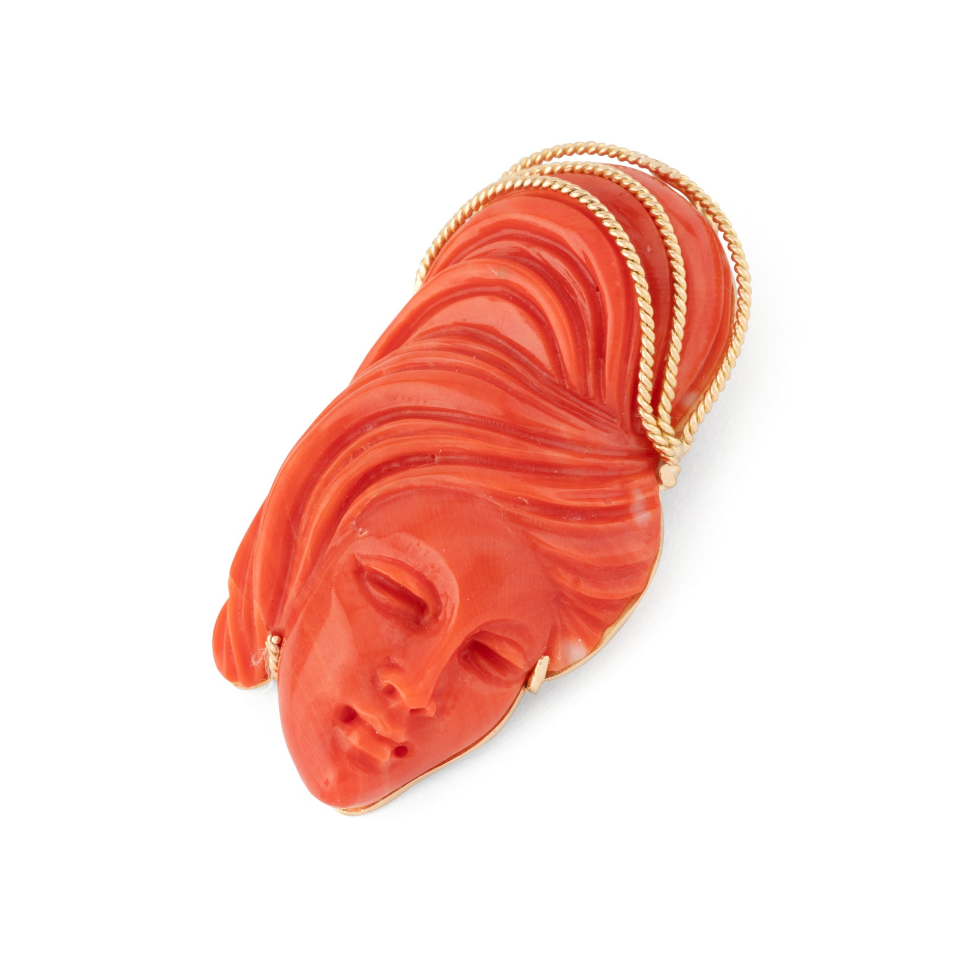 Pendentif en corail sur or jaune, représentant une tête de femme, ciselée.