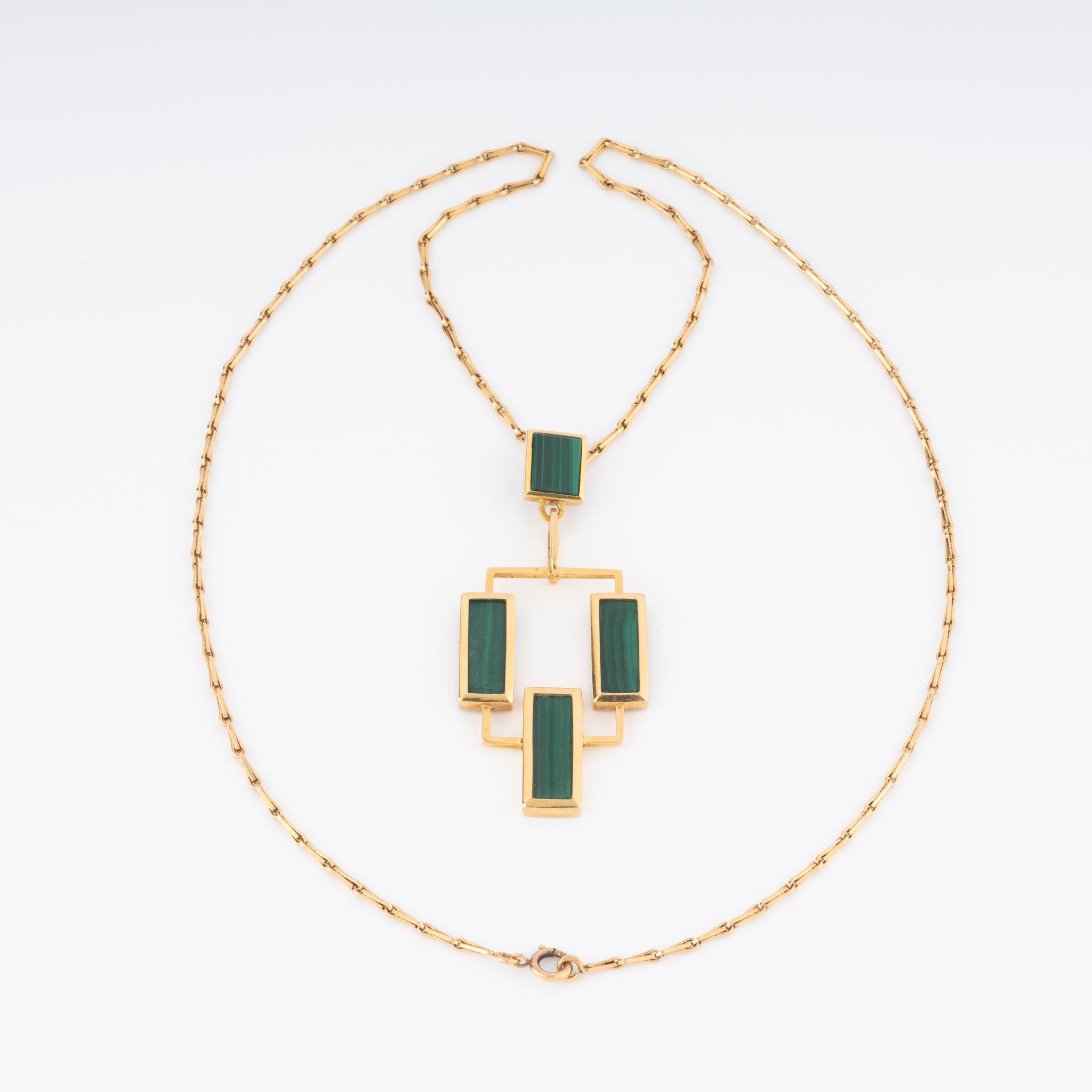 Un Pendentif géométrique en or jaune à motifs rectangulaires orné de plaque malachite, ornée d'une chaine maillon long.