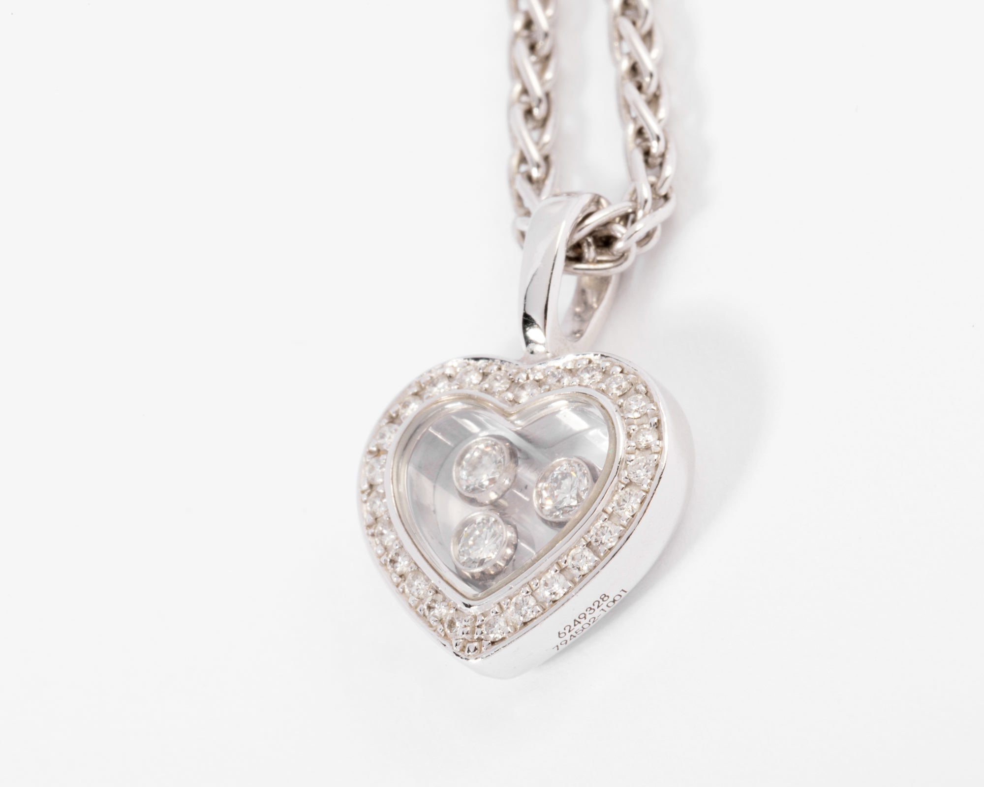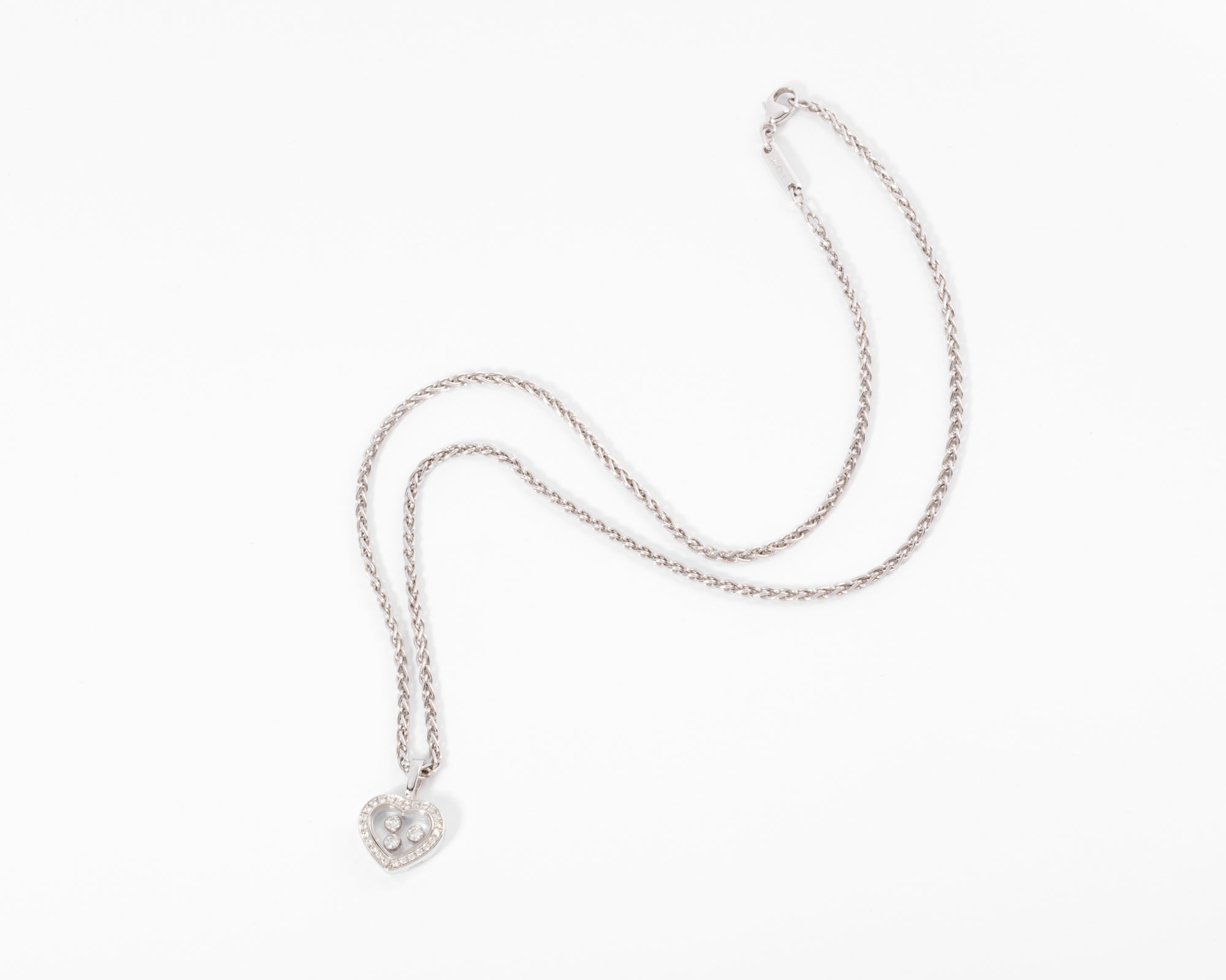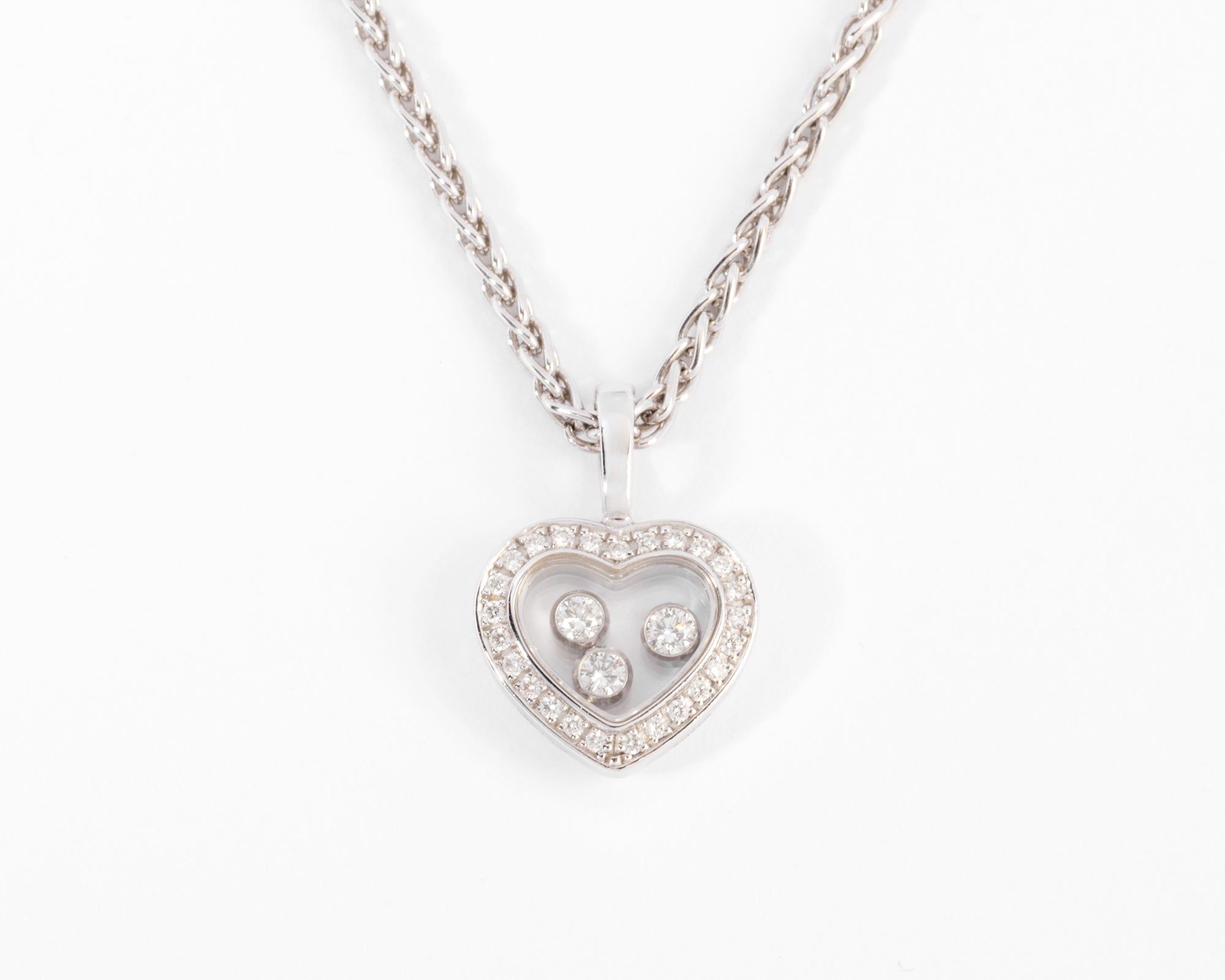 Pendentif or gris signé de la Maison Chopard modèle "Happy Diamonds",le pendentif en forme de cœur est orné en son centre de trois diamants mobiles. Le pourtour du cœur est serti de diamants taille brillant sur une chaine maille palmier.