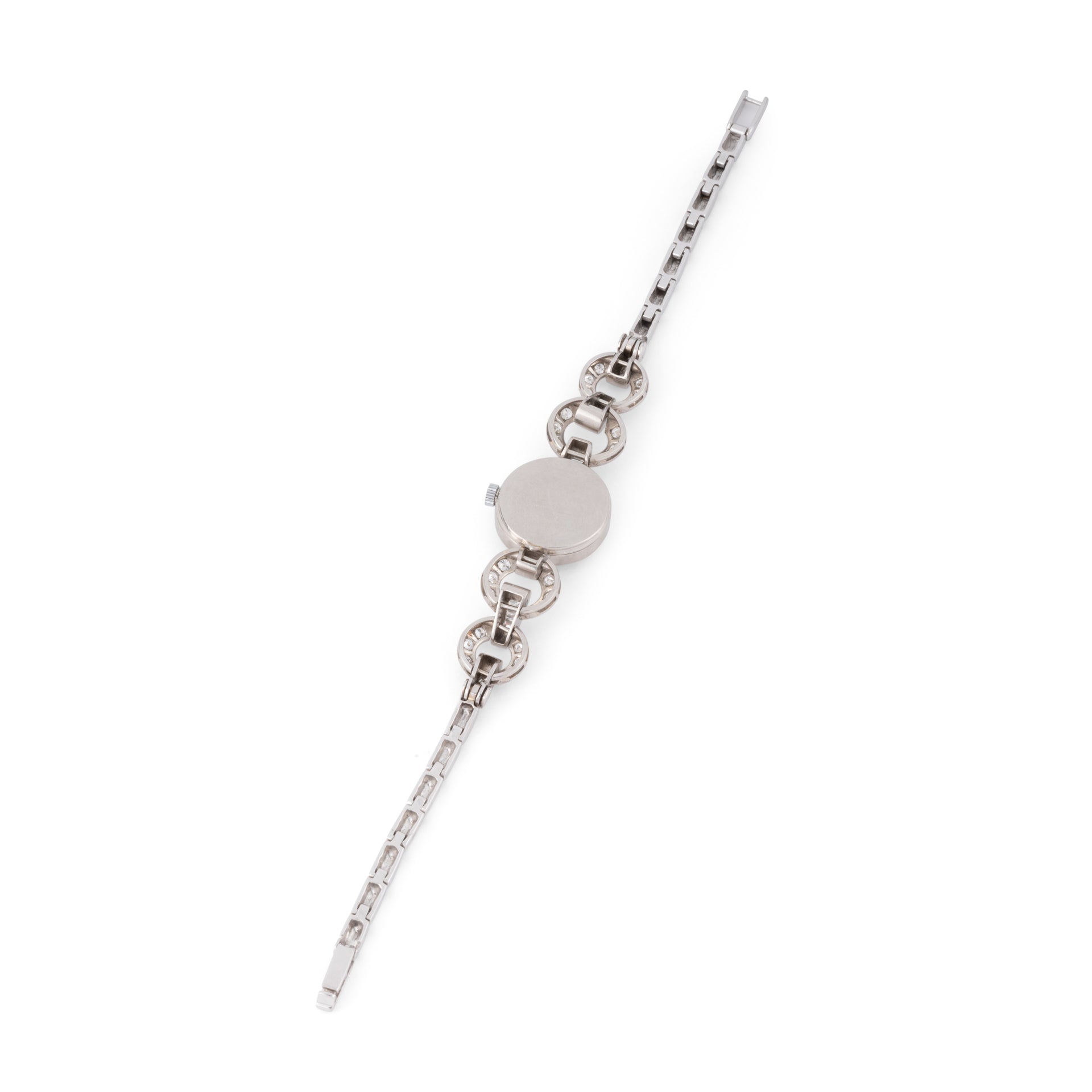 Belle Montre art déco en Platine,or et Diamants enrichi de maillons ronds agrémentés de diamants baguettes et diamant taille brillant.le mouvement est à quartz.