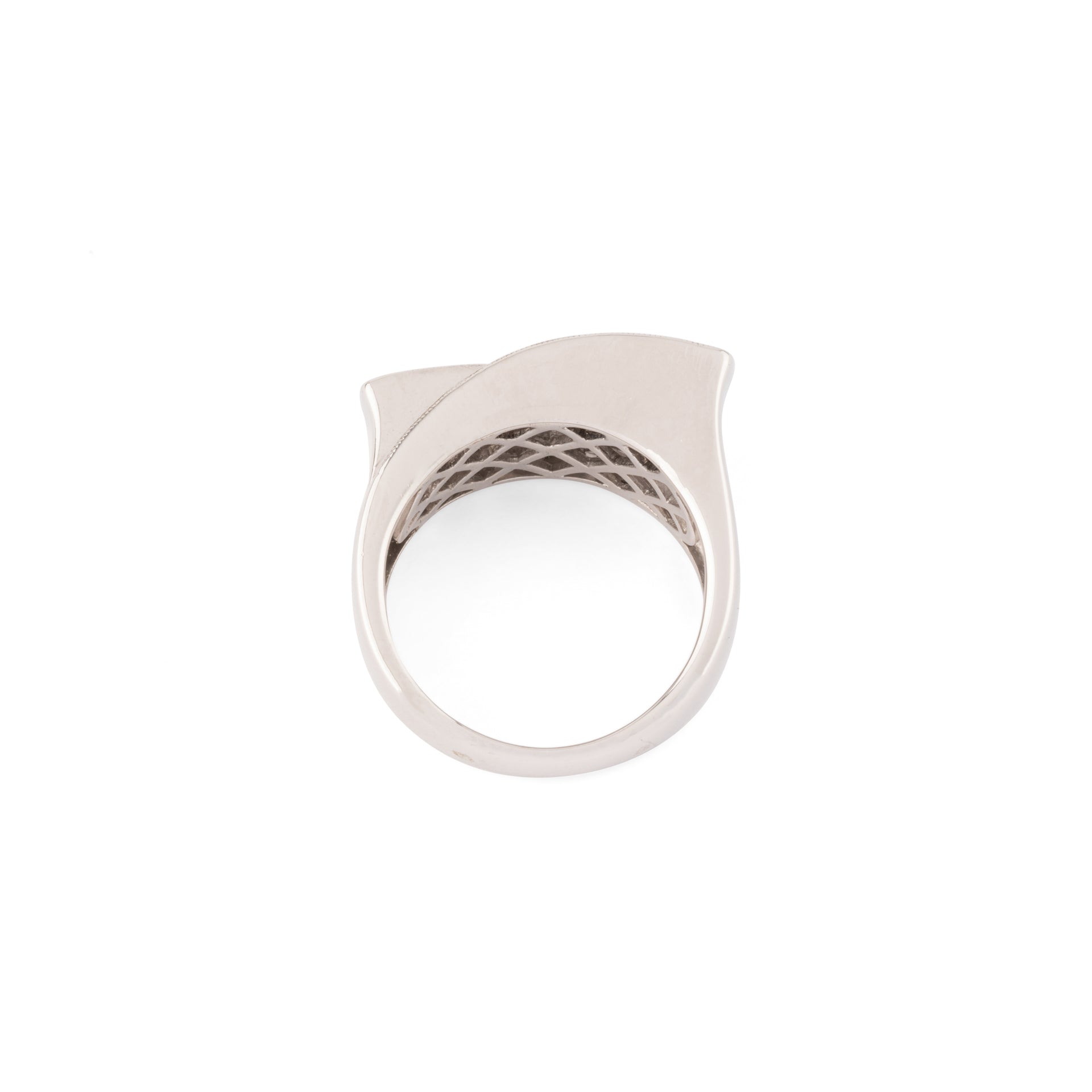 Bague en or gris design en diamant taille princesse sur 2 sertis rails qui se croisent.