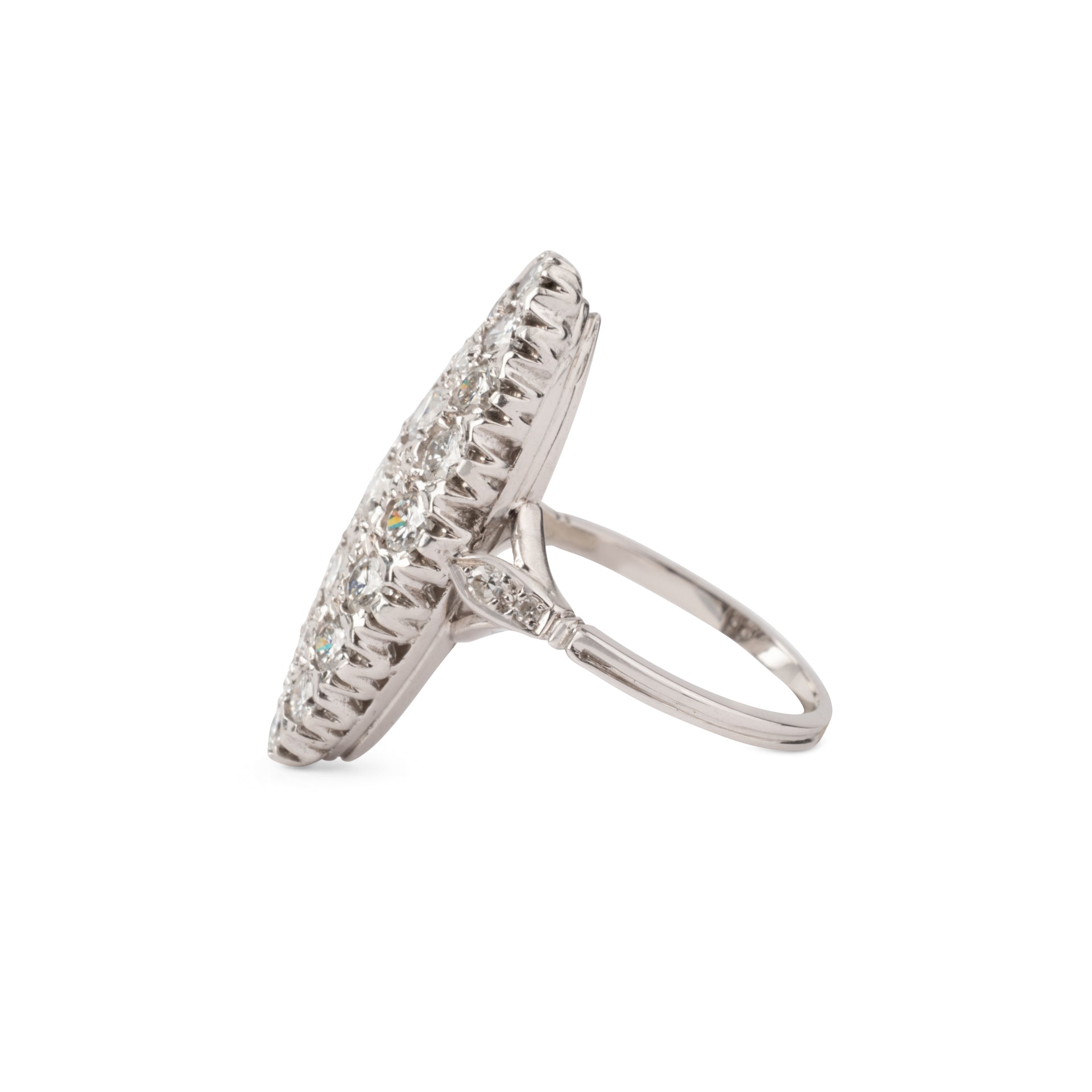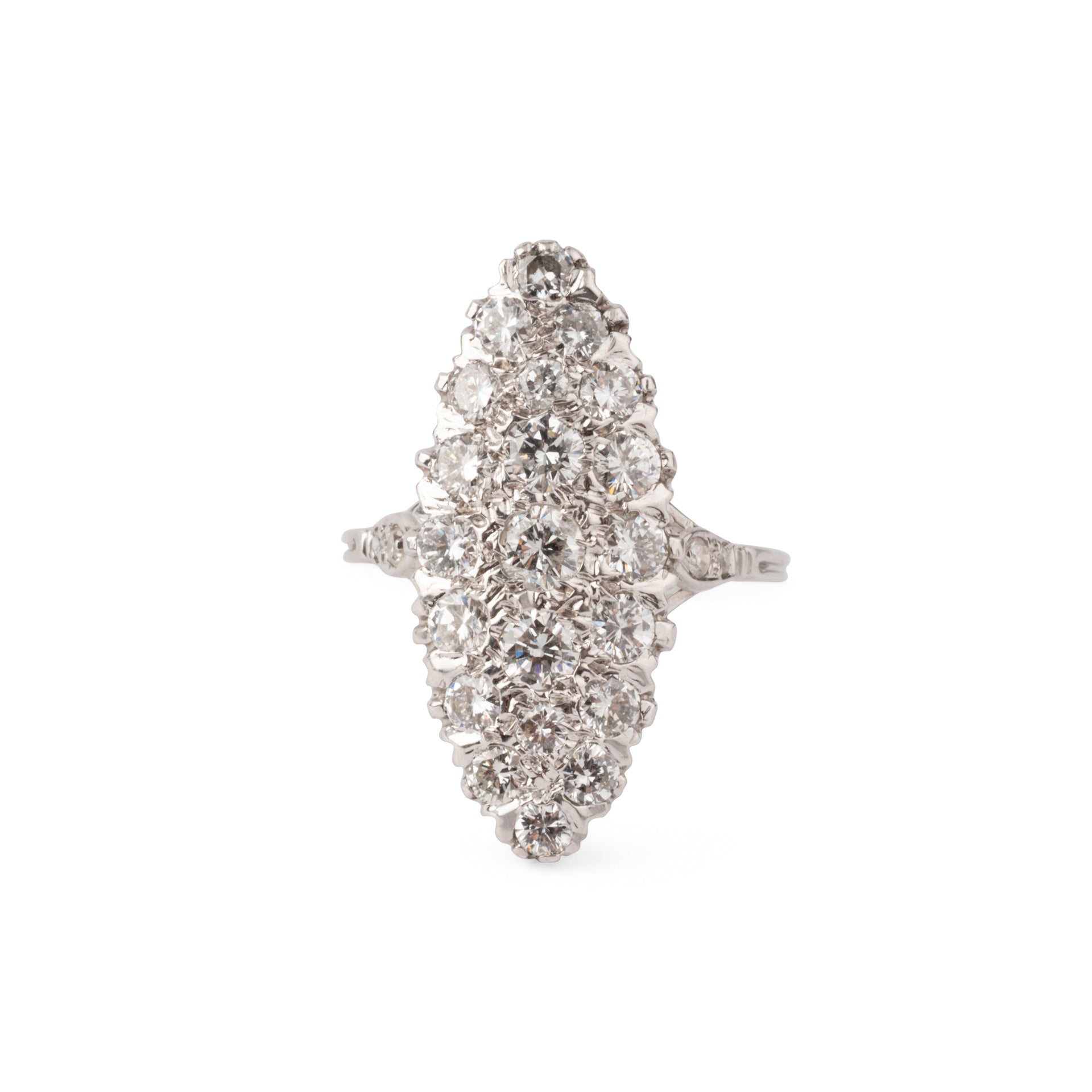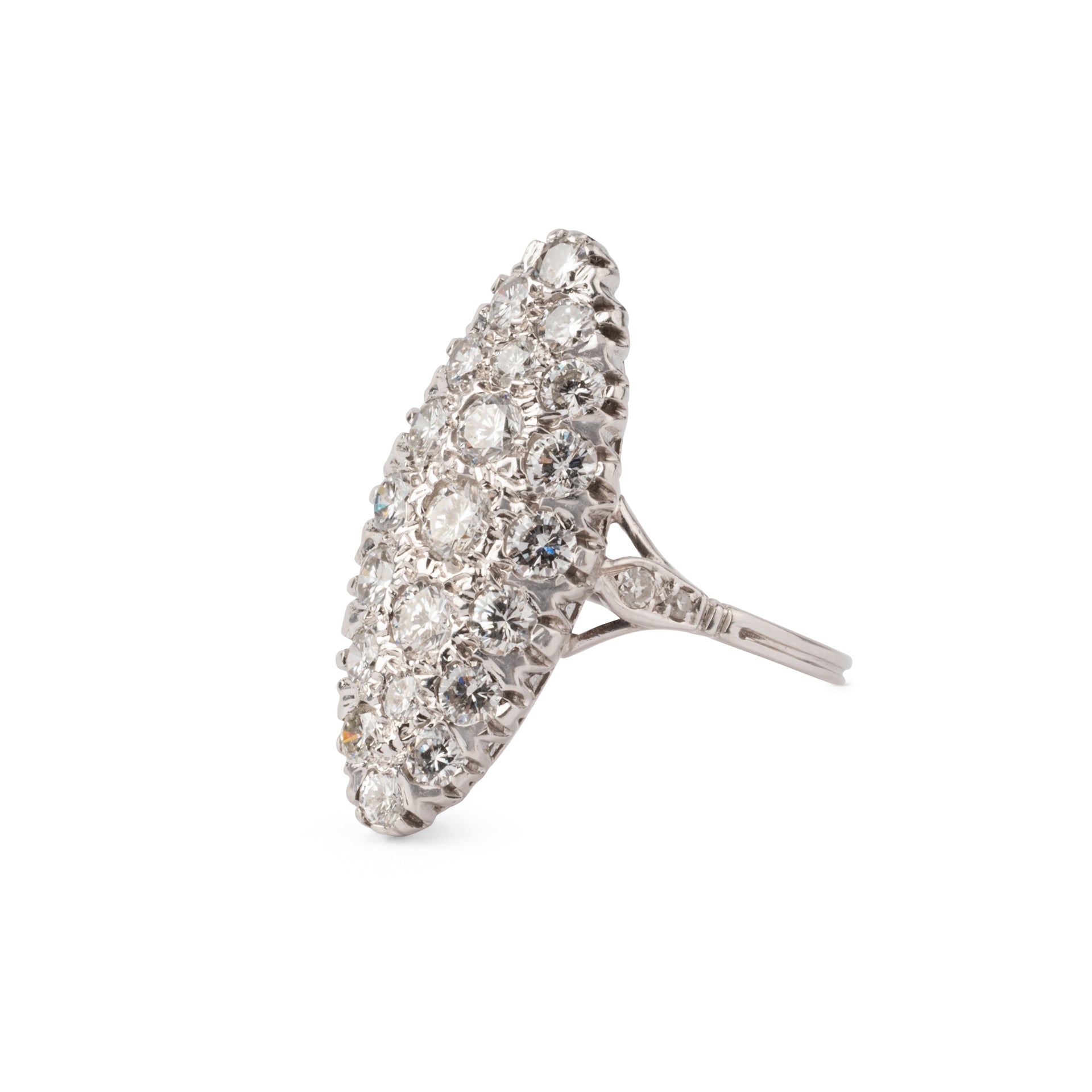 Bague marquise en or gris entièrement sertie de diamants sur un délicat serti.