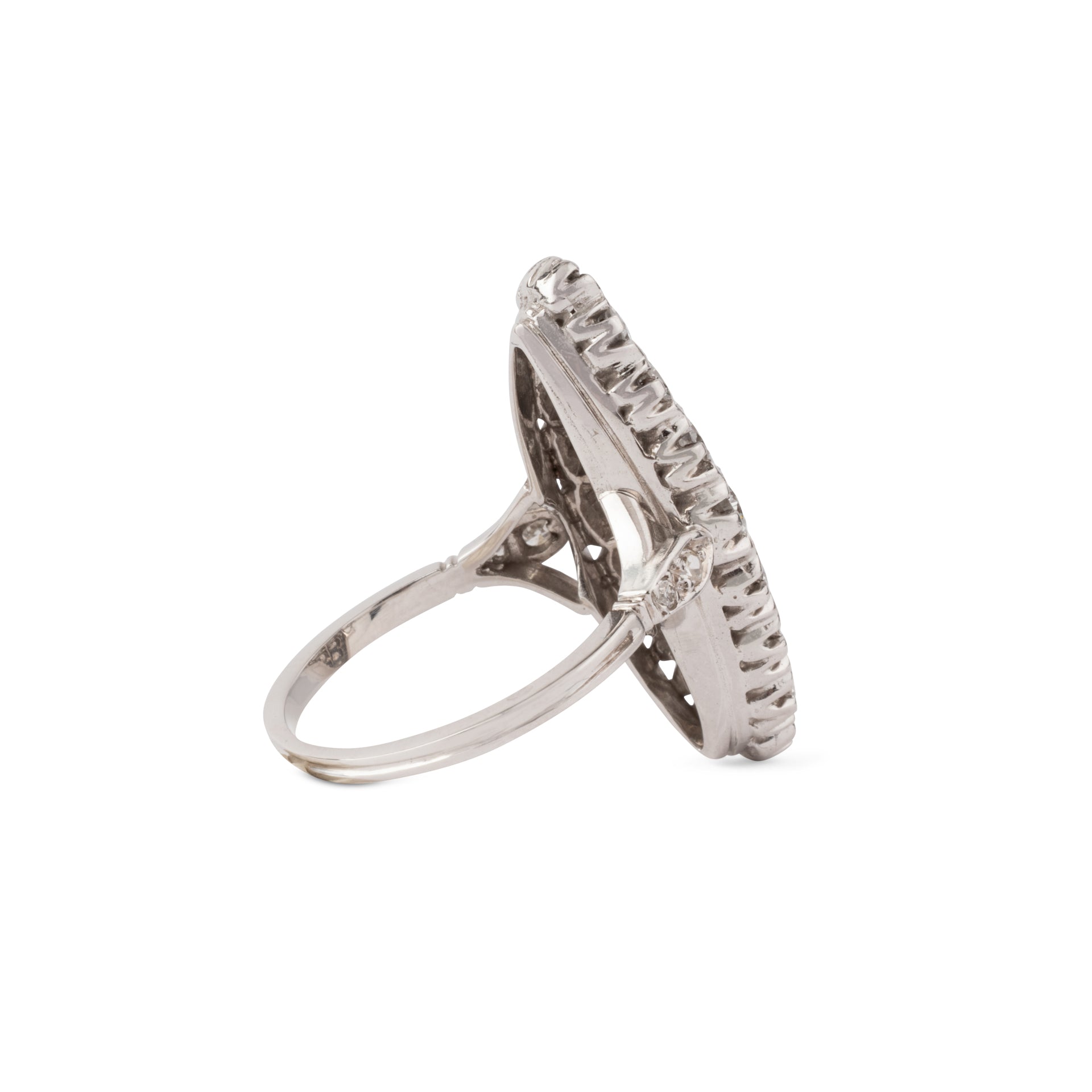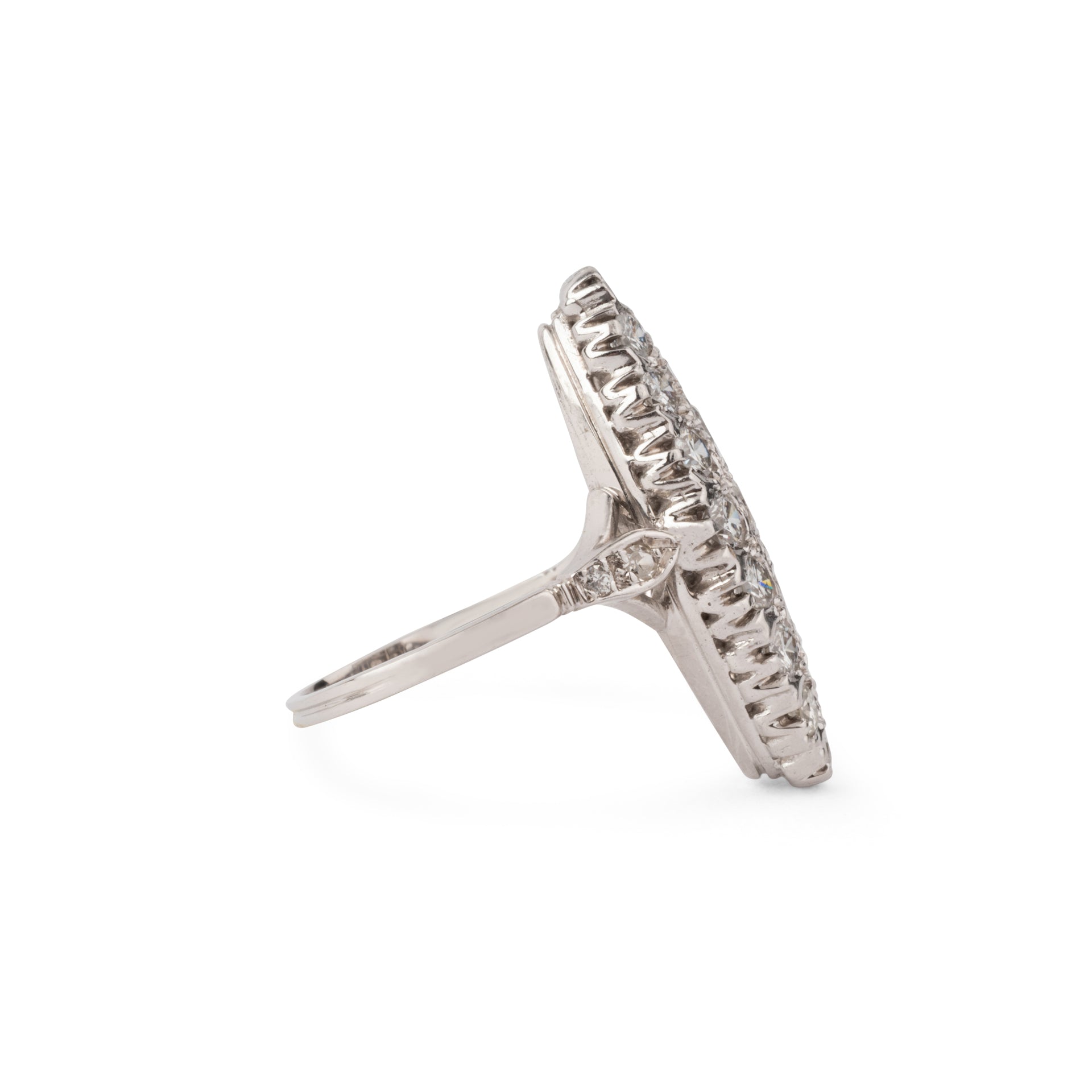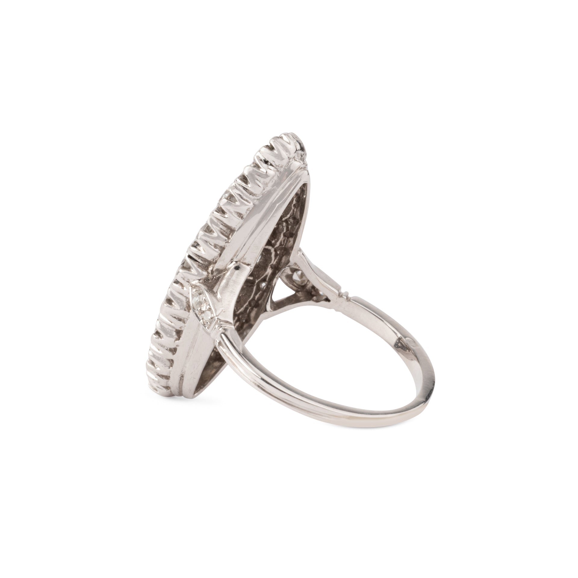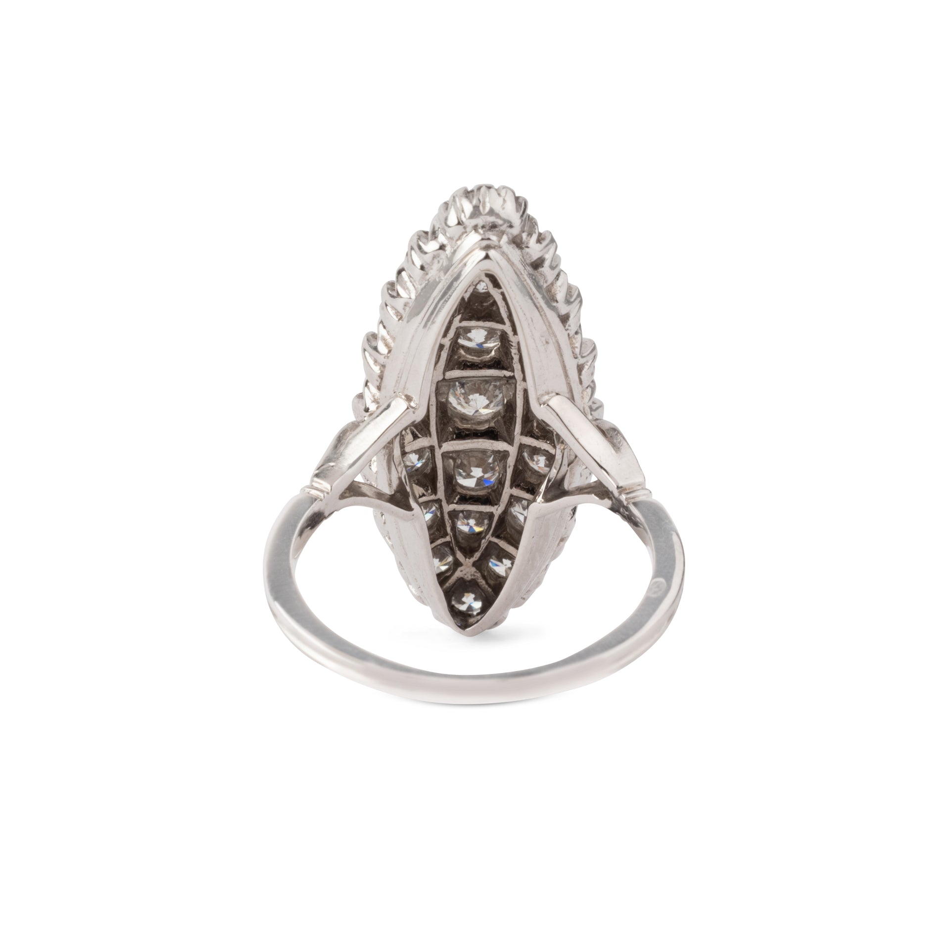 Bague marquise en or gris entièrement sertie de diamants sur un délicat serti.