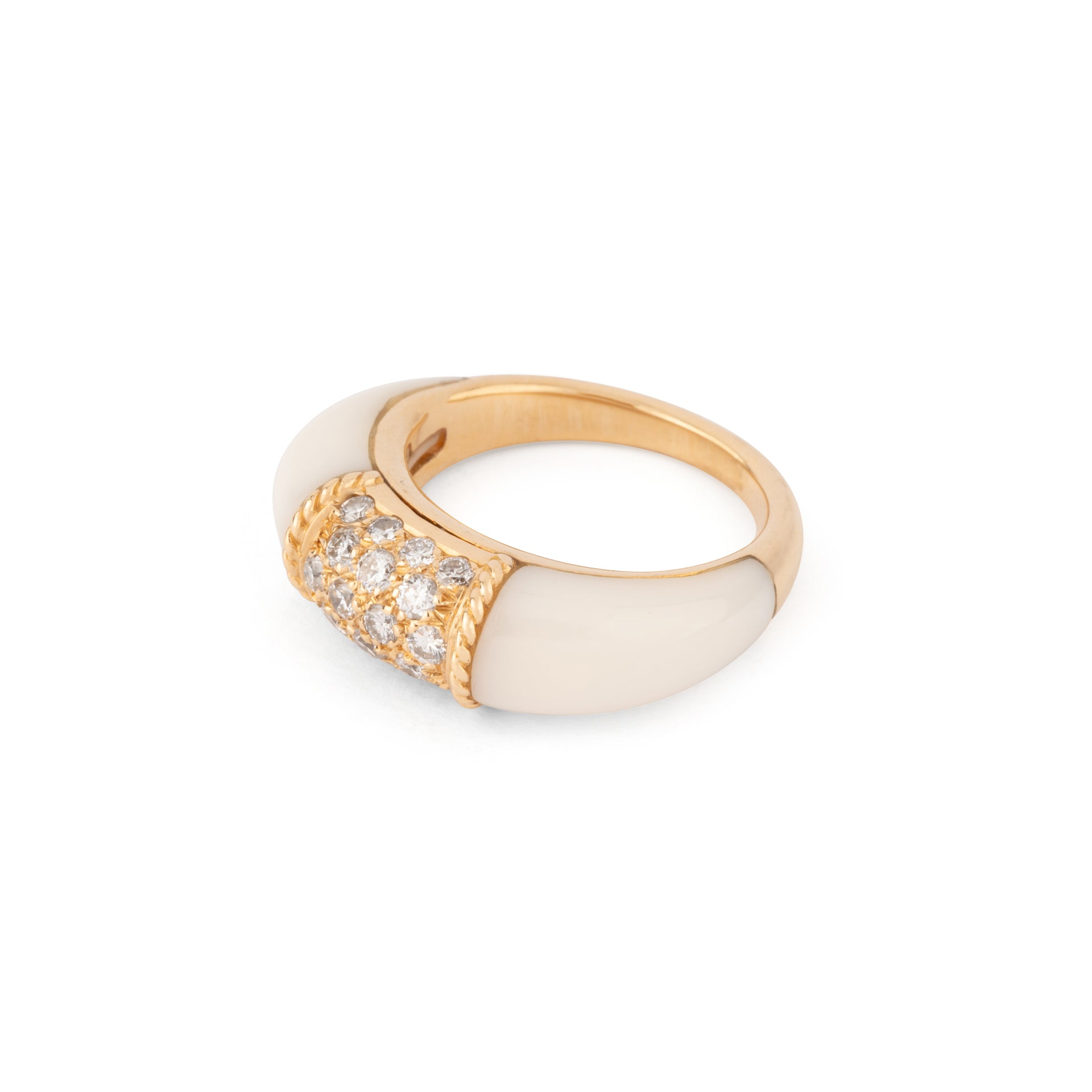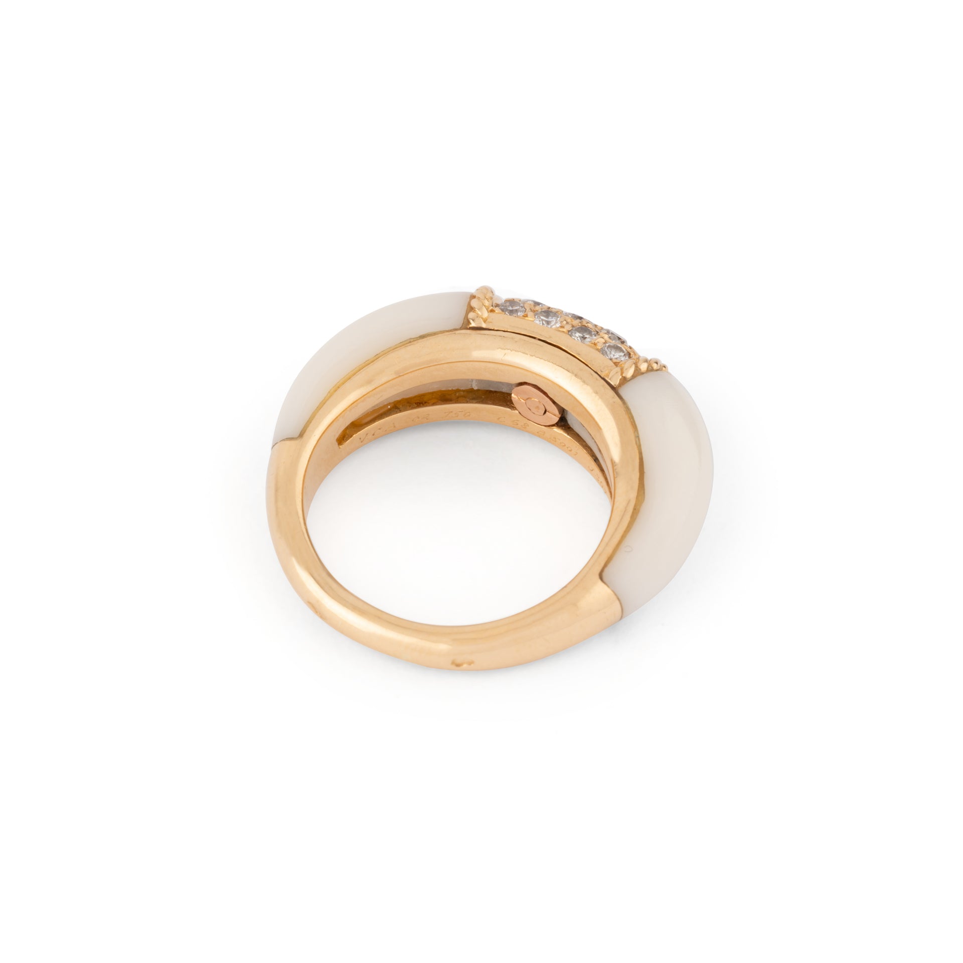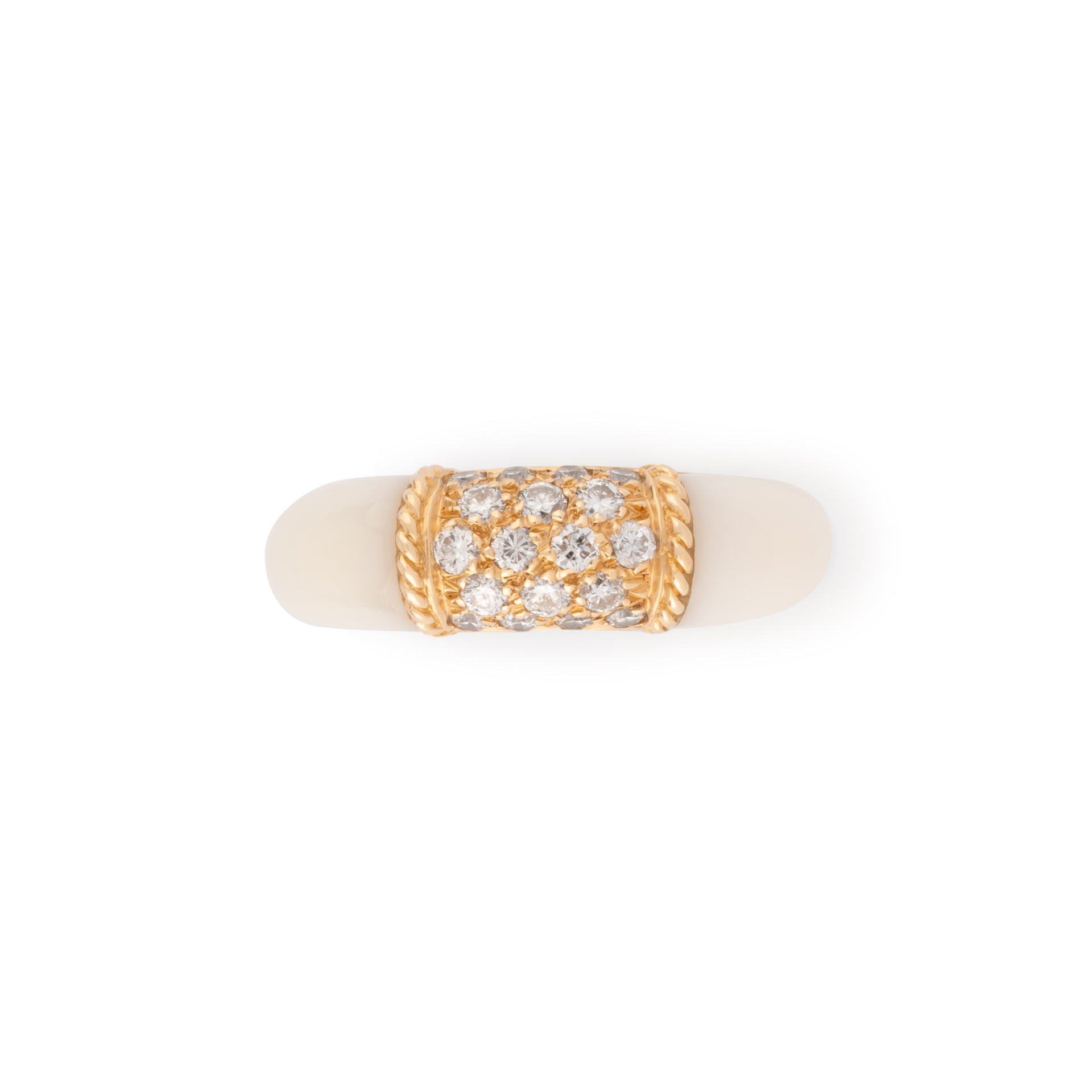Bague Van Cleef & Arpels Philippine en or jaune et corail blanc et diamants, composée d'un anneau en chute en or jaune, ornée en son centre d'un très beau pavage de diamants de taille brillant pesant environ 0.35 carat, réhaussée de 2 magnifiques cabochons bombés en en corail blanc .