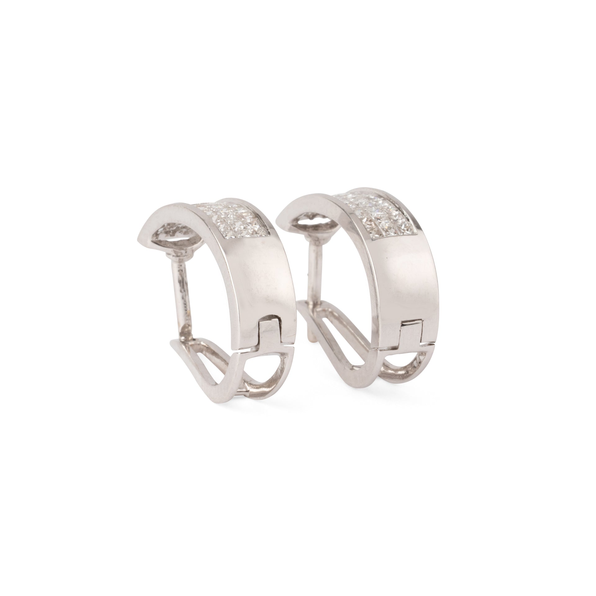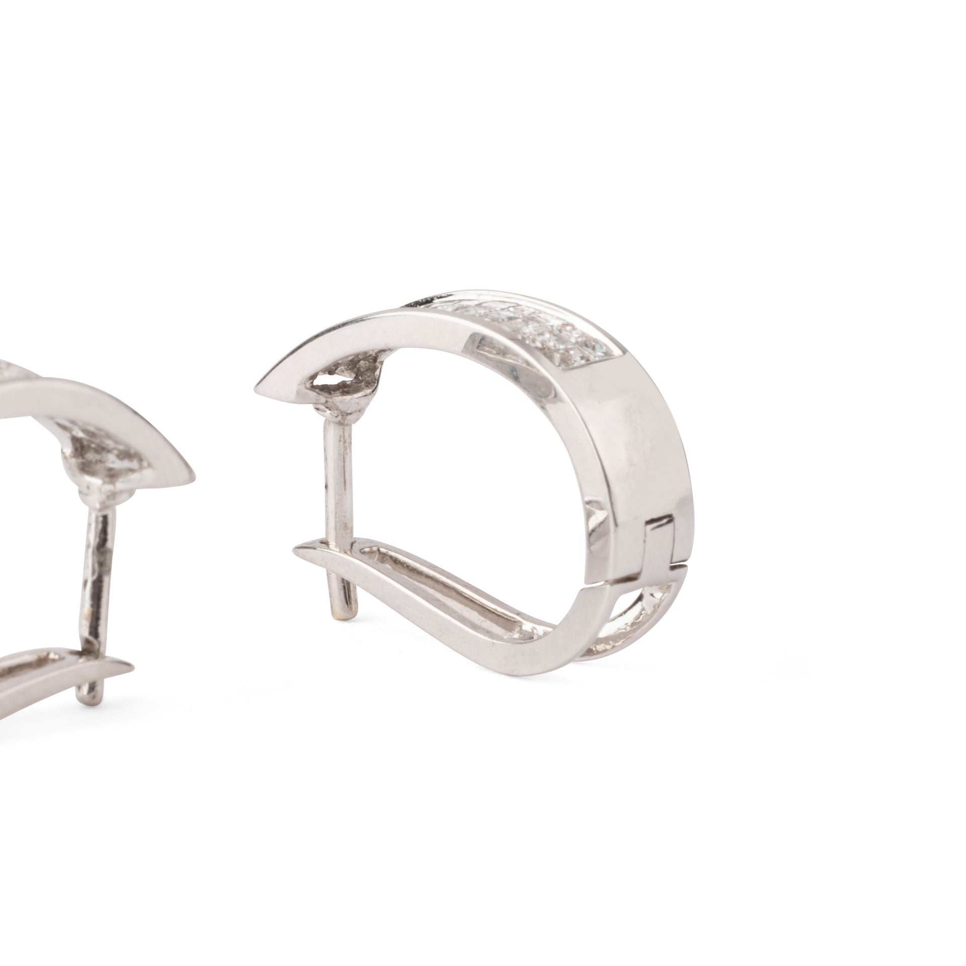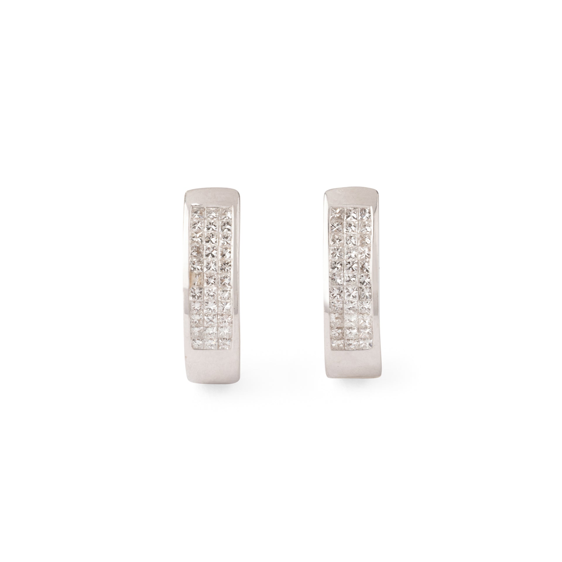 Créoles en or gris 18k serties de trois lignes de diamants taille princesse pour un éclat structuré et sophistiqué.