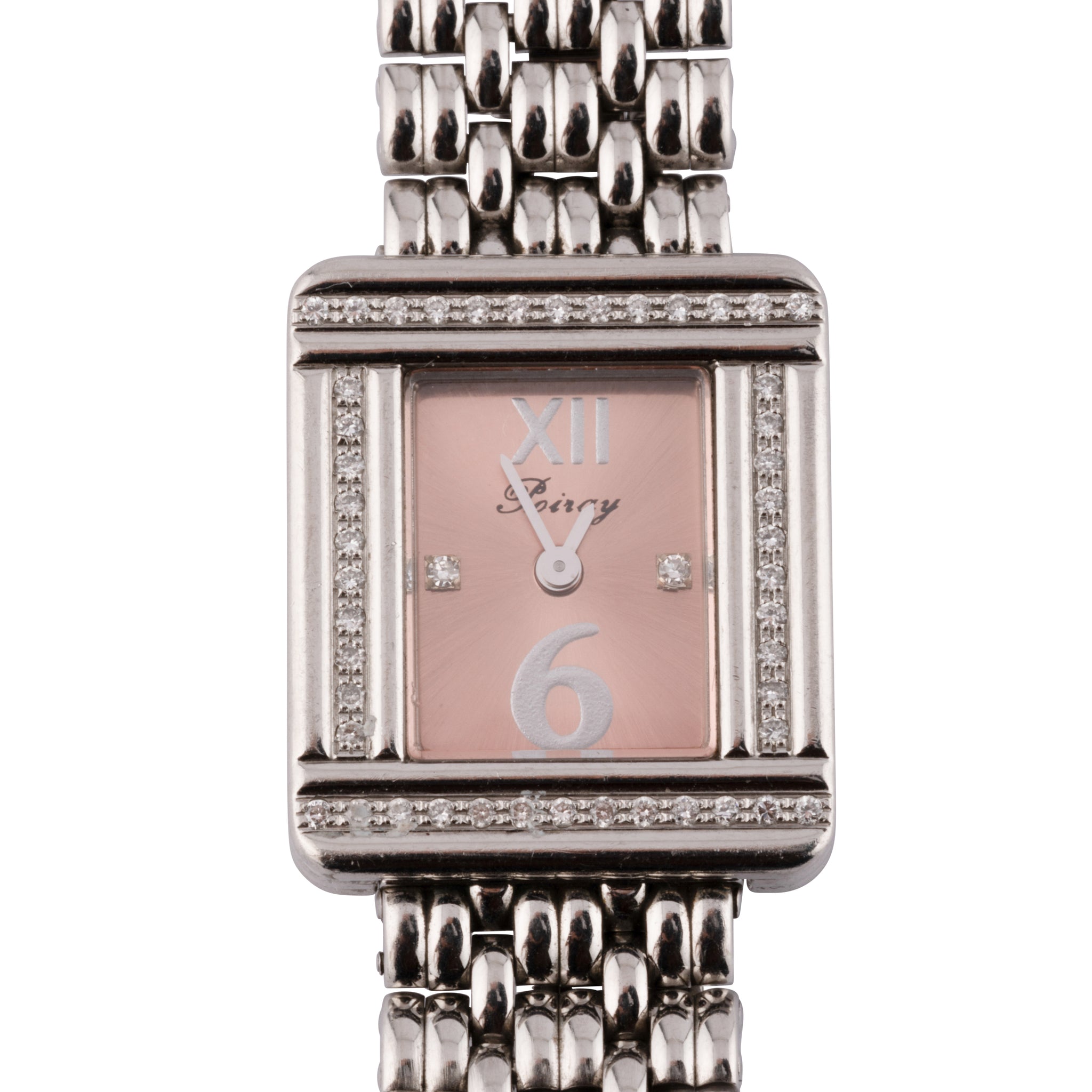 Montre en acier ,or gris et diamant Poiray modèle ma première mini.Le fond est nacre rose entouré de diamant.