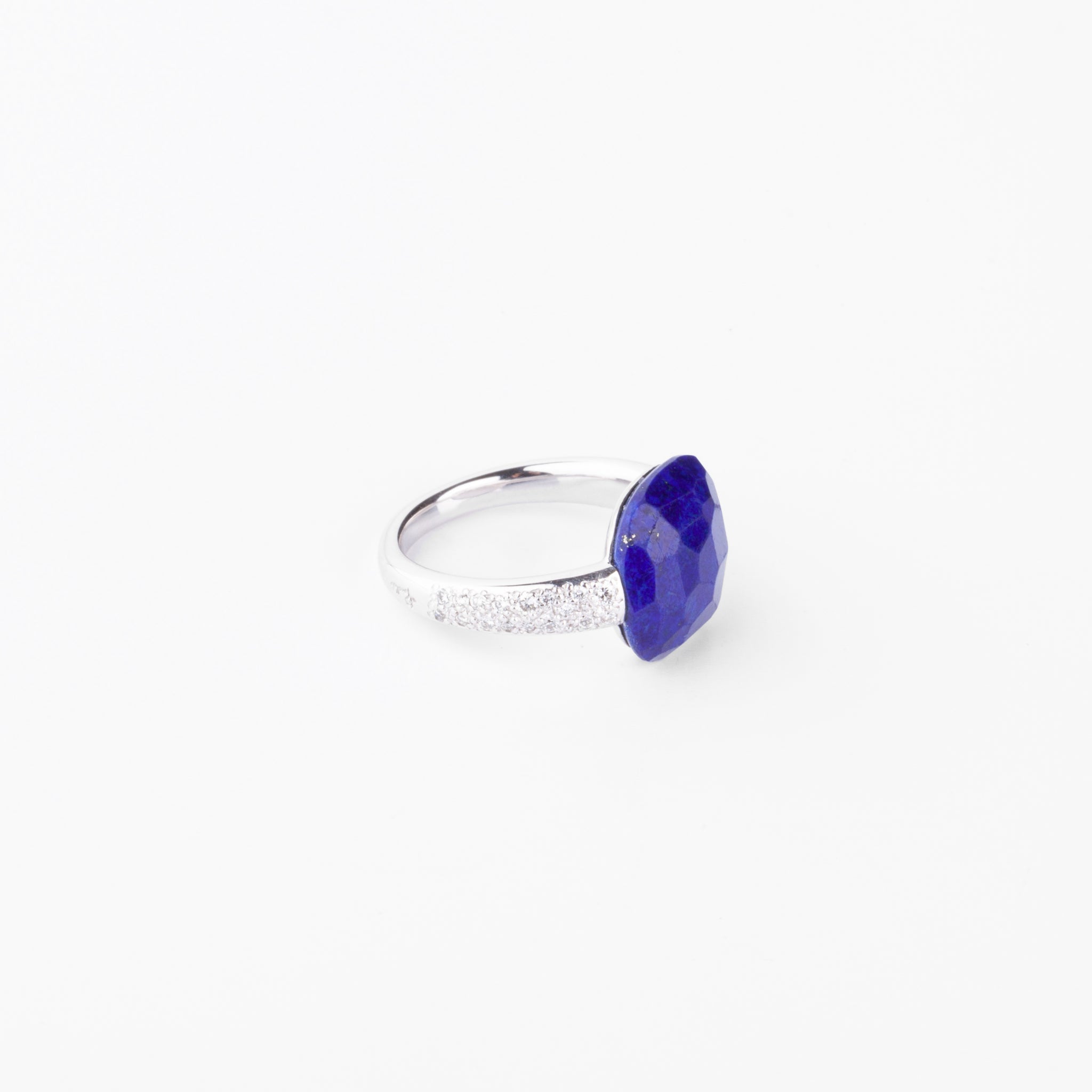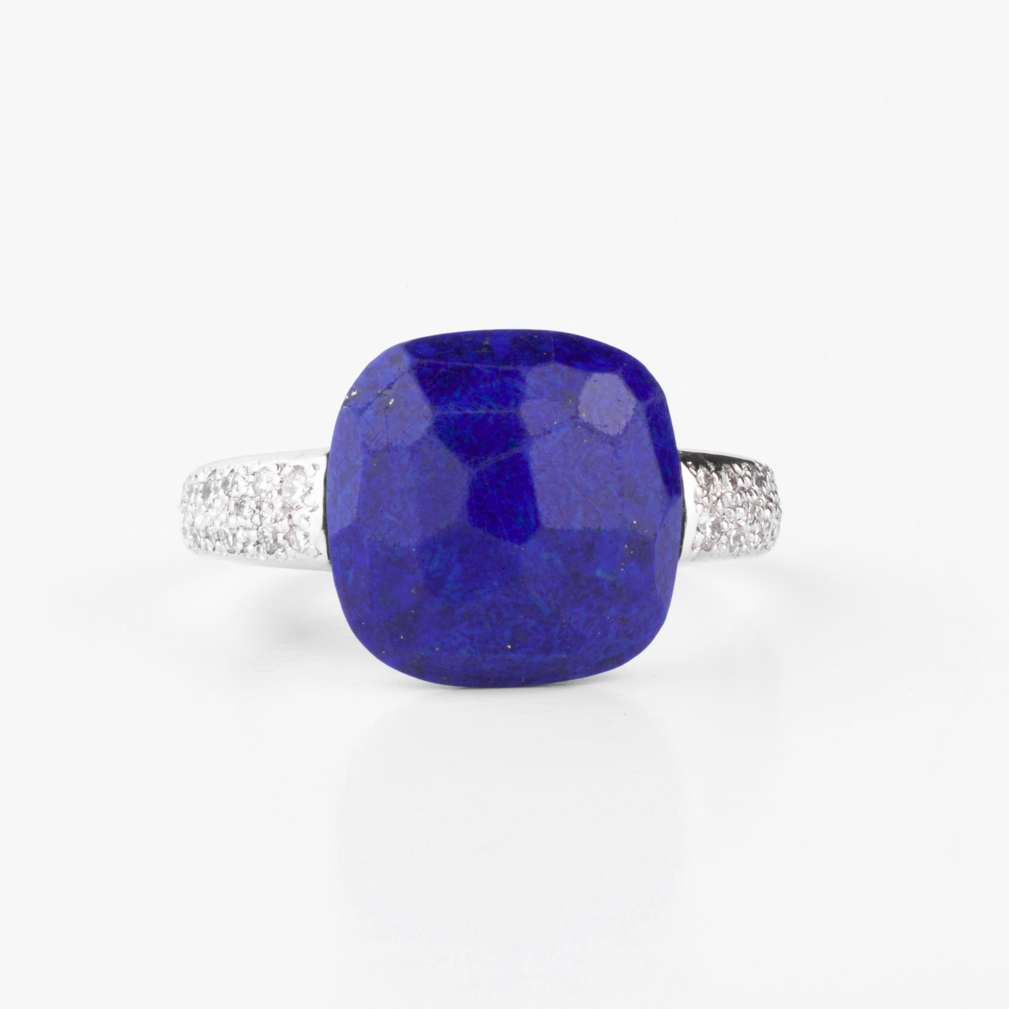 Une bague signée de la Maison Pomellato, collection 'Capri' ornée d'un lapis lazuli de forme coussin épaulée de part et d'autre de diamants taille brillant.
