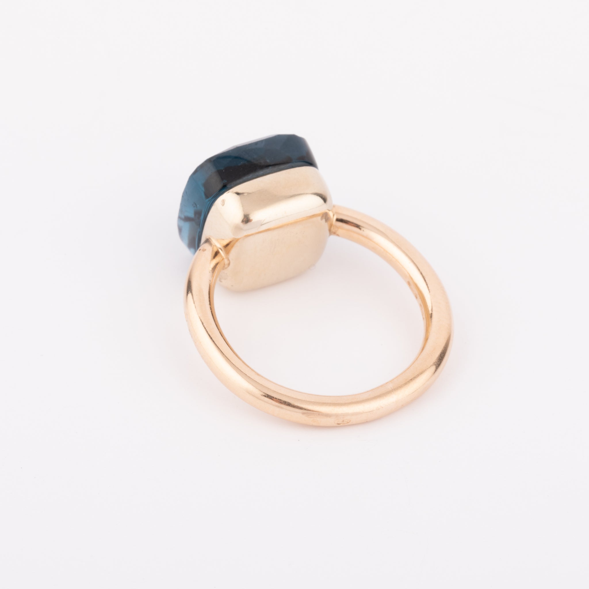 Bague de la maison Pomellato Nudo Maxi en or rose composé d'un important cabochon facetté en topaze bleu couleur london blue sur un anneau bombé en or rose.