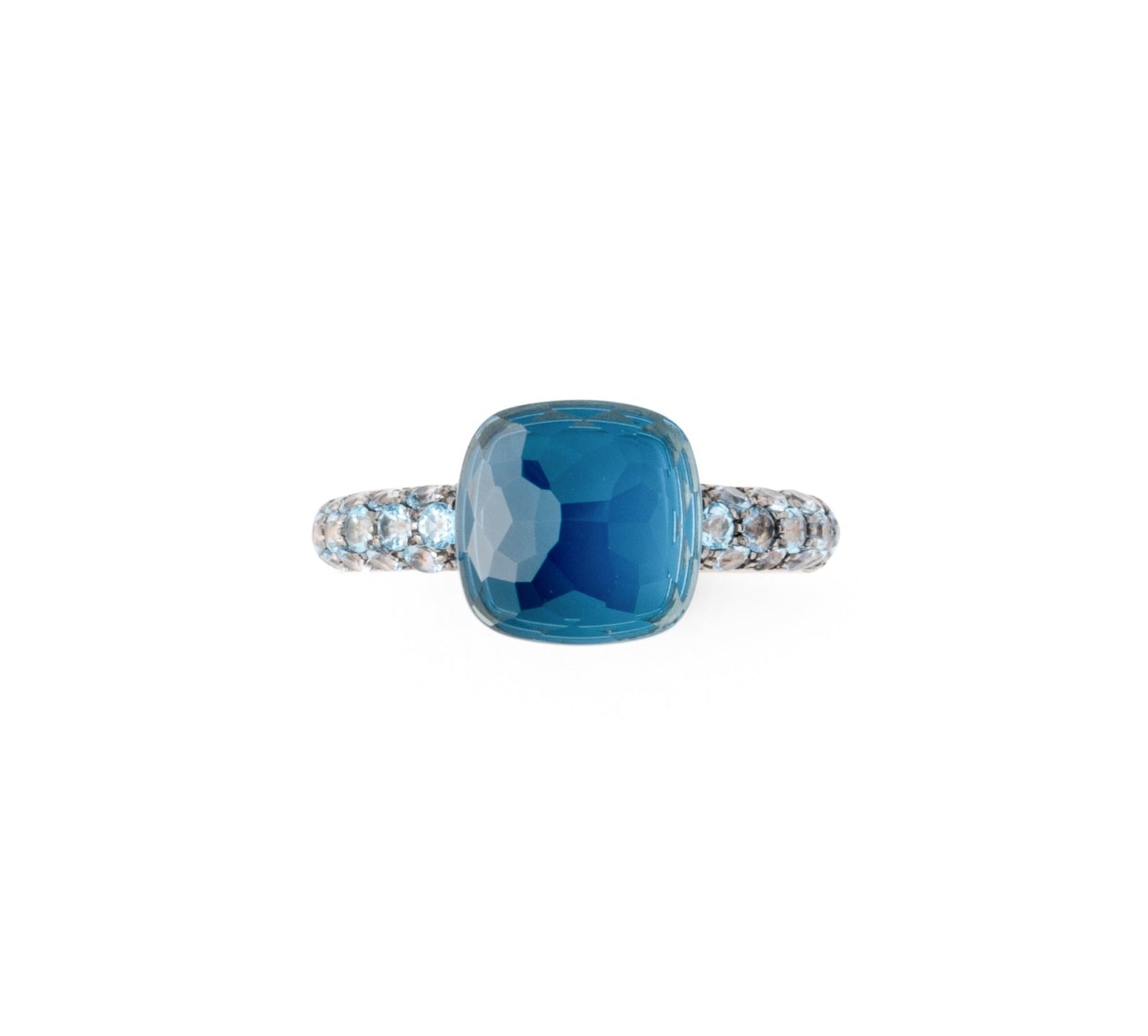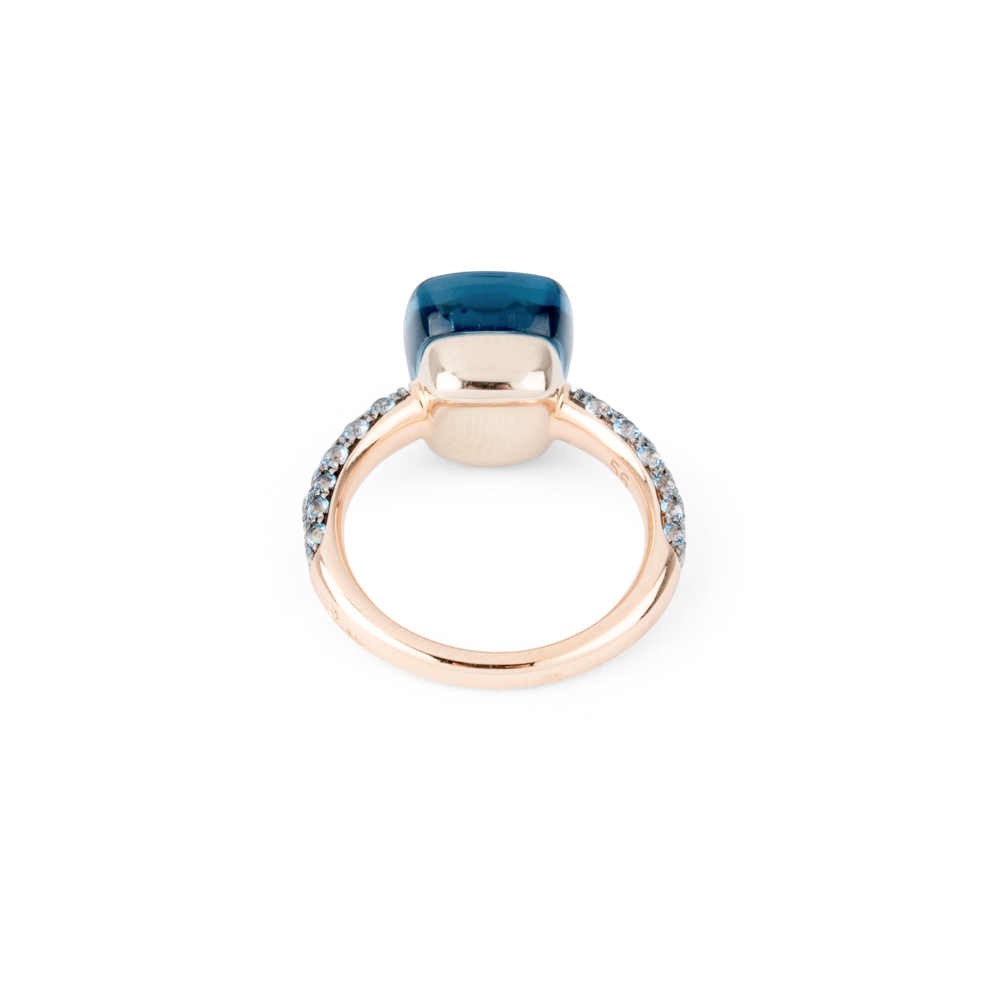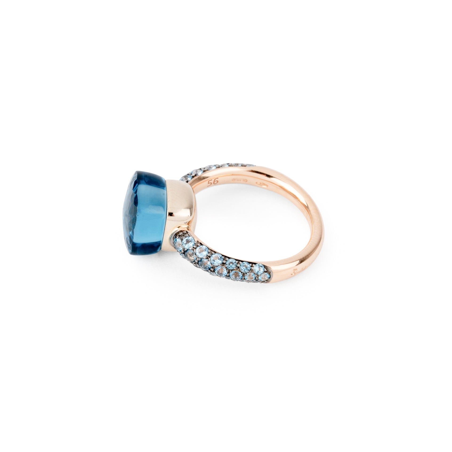 Bague de la maison Pomellato modèle Nudo en or rose et topazes bleues au centre et sur les cotés.