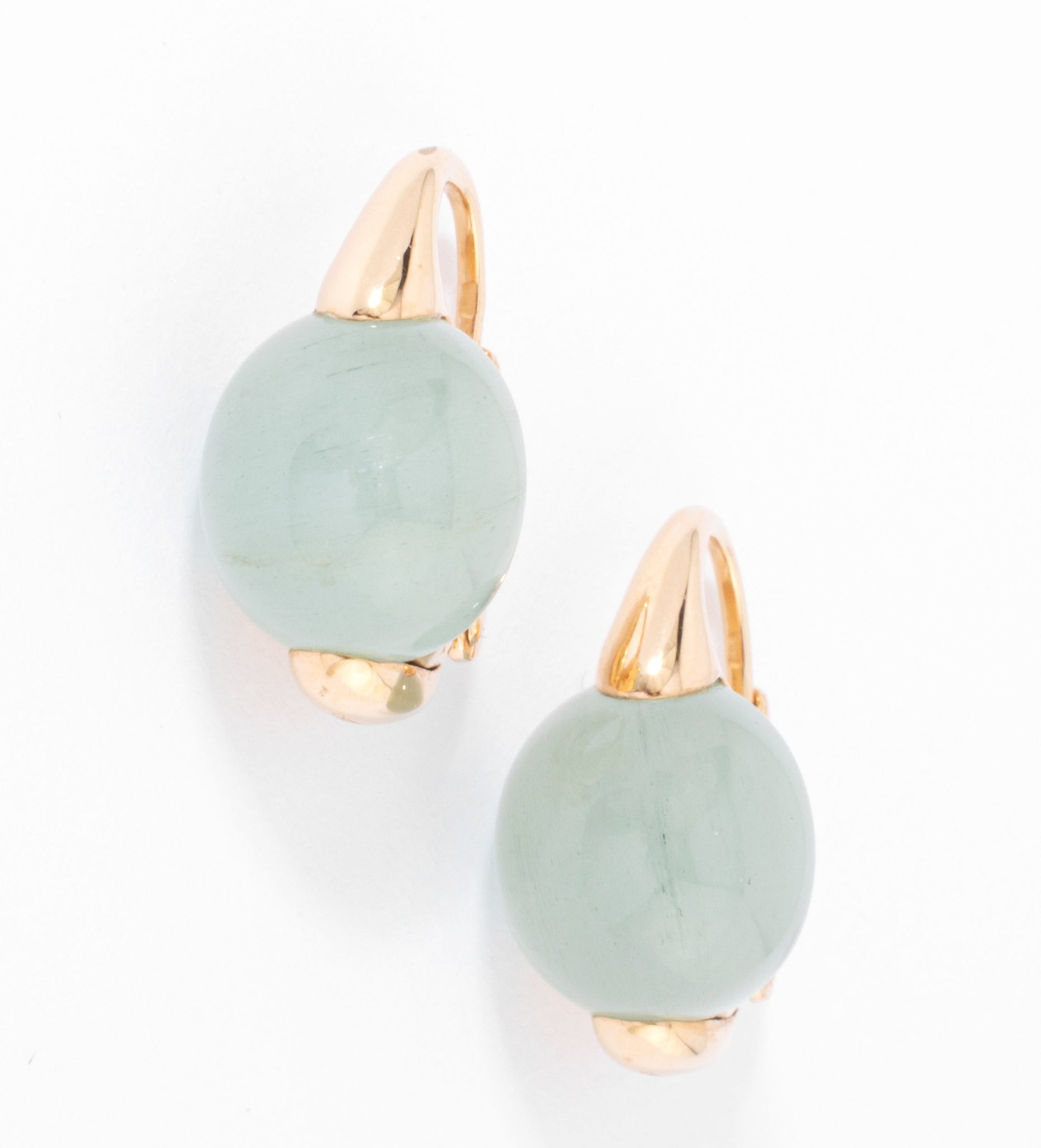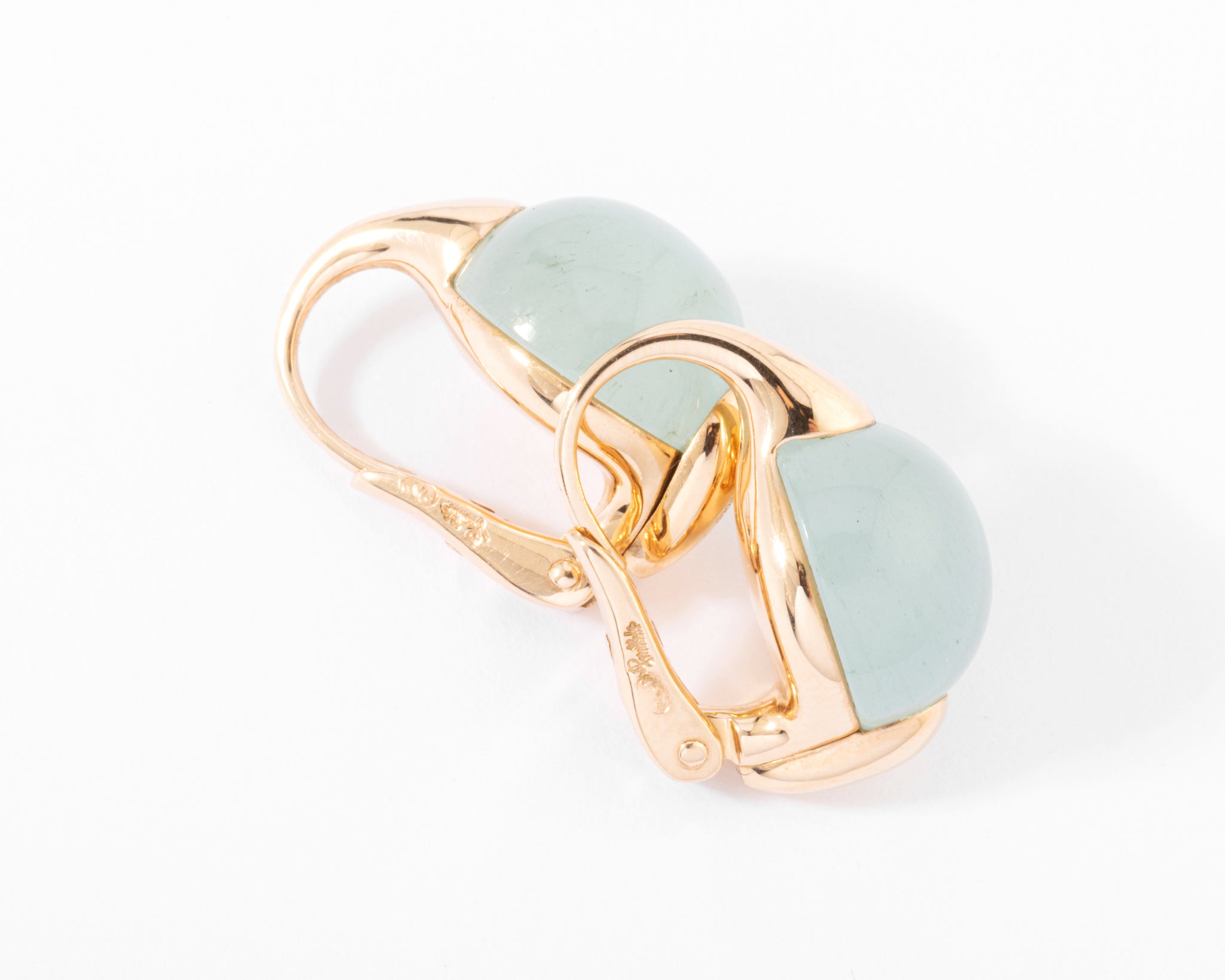 Paire de boucles d'oreilles de la maison Pomellato modèle Luna en or rose composée en son centre d'un important cabochon ovale en aigue marine lactée.