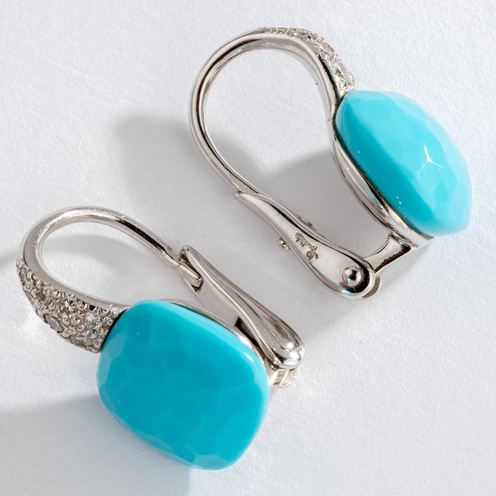 Rare paire de boucles d'oreilles de la maison Pomellato modèle Capri en or gris ,et diamants, ornée d'une turquoise facetté, sur le dessus d'un anneau pavée de diamants de taille brillant.