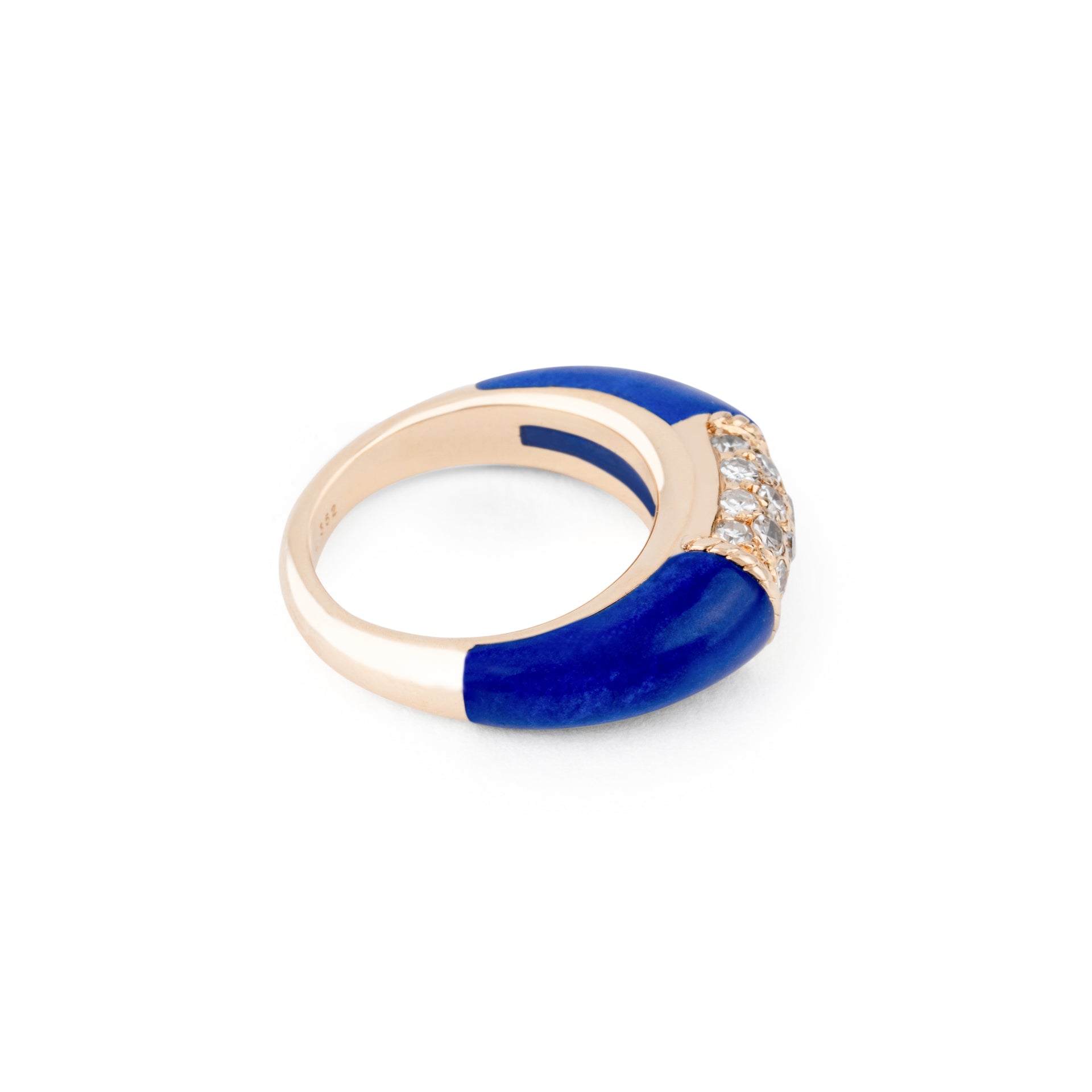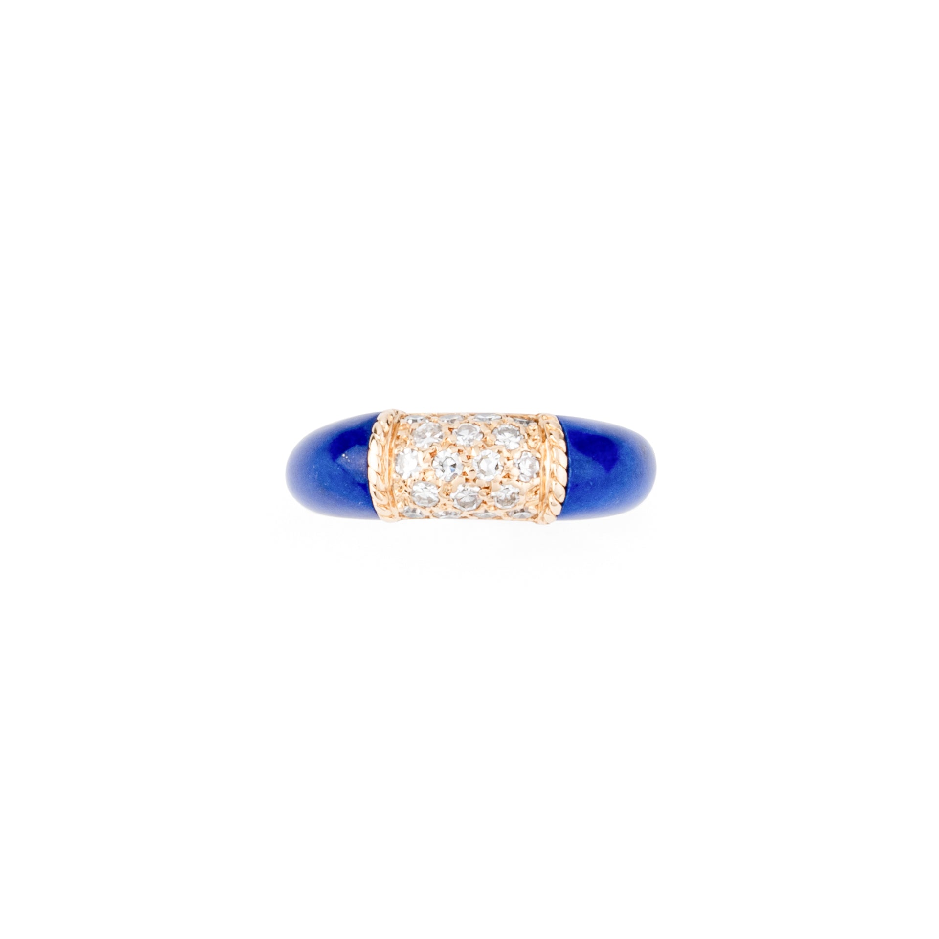 Bague Van Cleef & Arpels Philippine en or jaune et lapis-lazuli et diamants, composée d'un anneau en chute en or jaune, ornée en son centre d'un très beau pavage de diamants de taille brillant pesant environ 0.35 carat, réhaussée de 2 magnifiques cabochons bombés en lapis-lazuli.