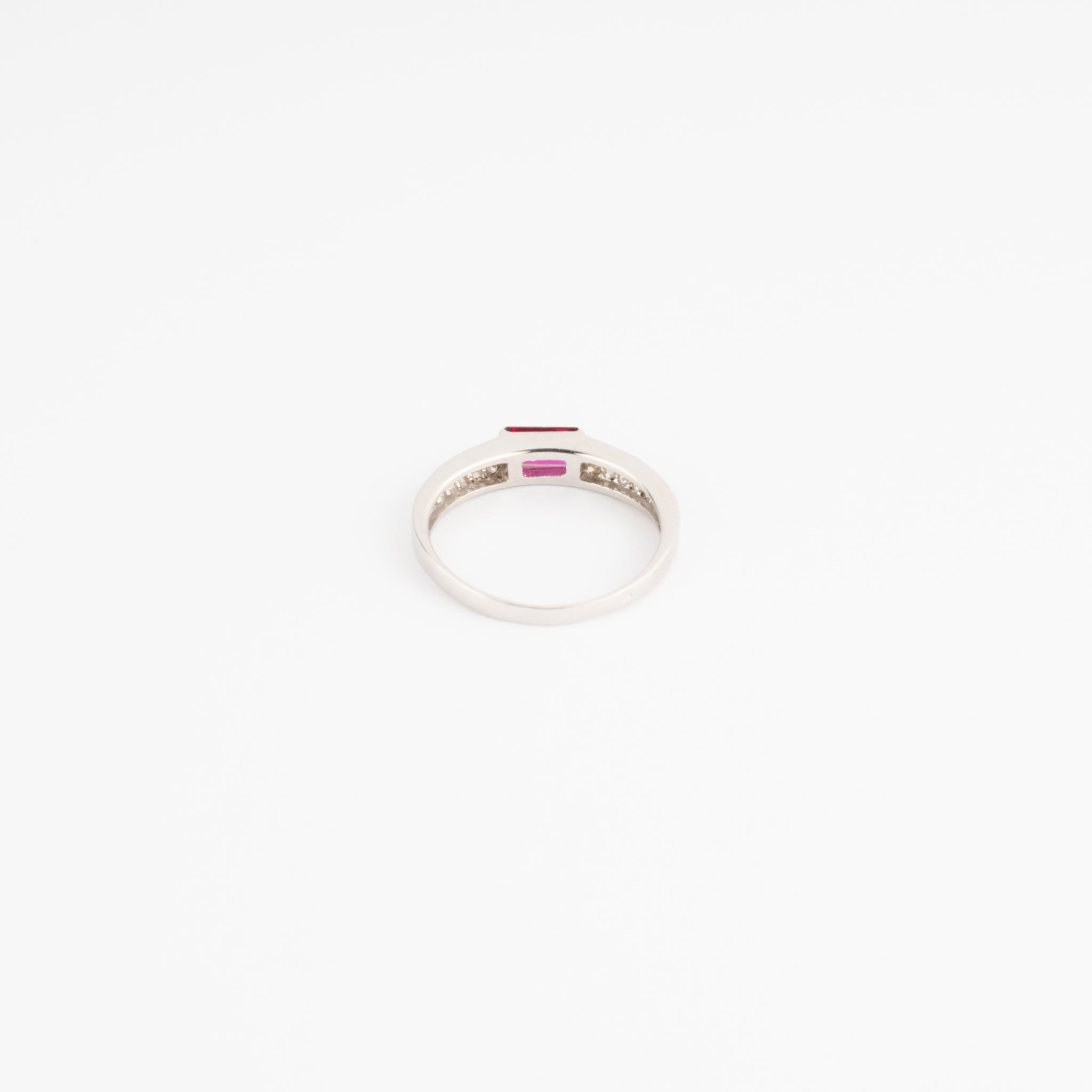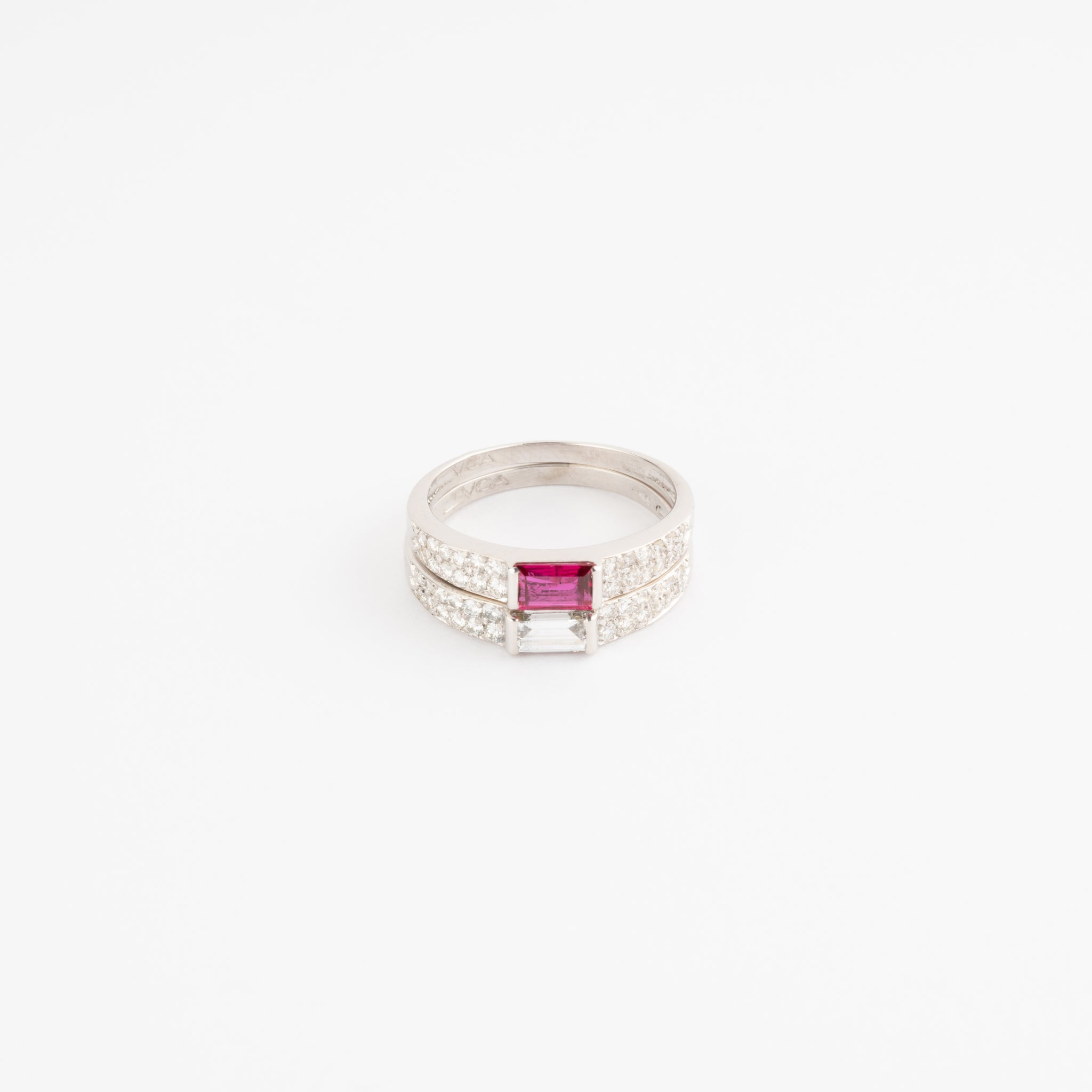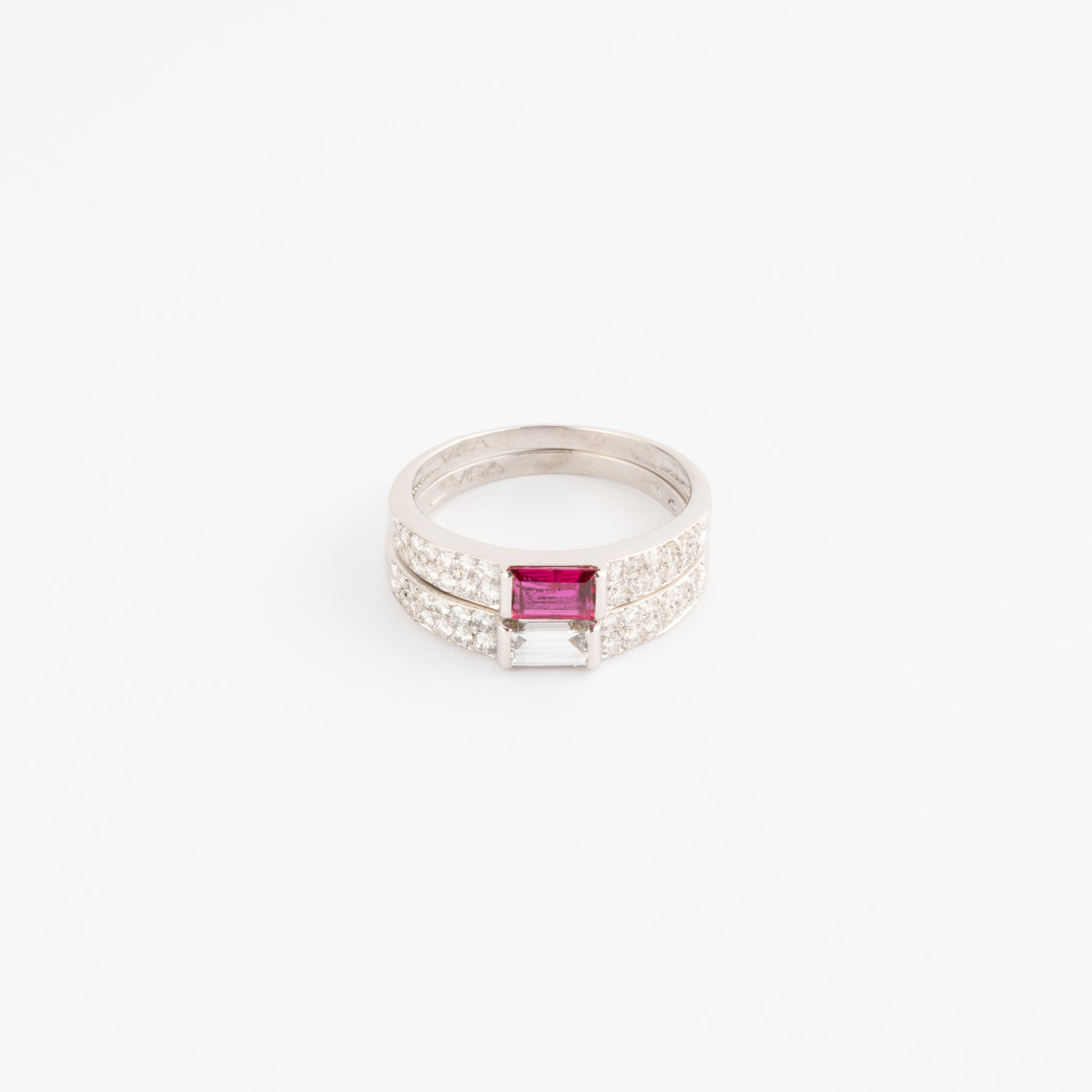 2 Bagues de la maison Van Cleef and Arpels ornées pour l'une d'un diamant taille émeraude et l'autre d'un rubis taille émeraude d'environ 0,10ct chacun sur une double descente de diamants de chaque côté.