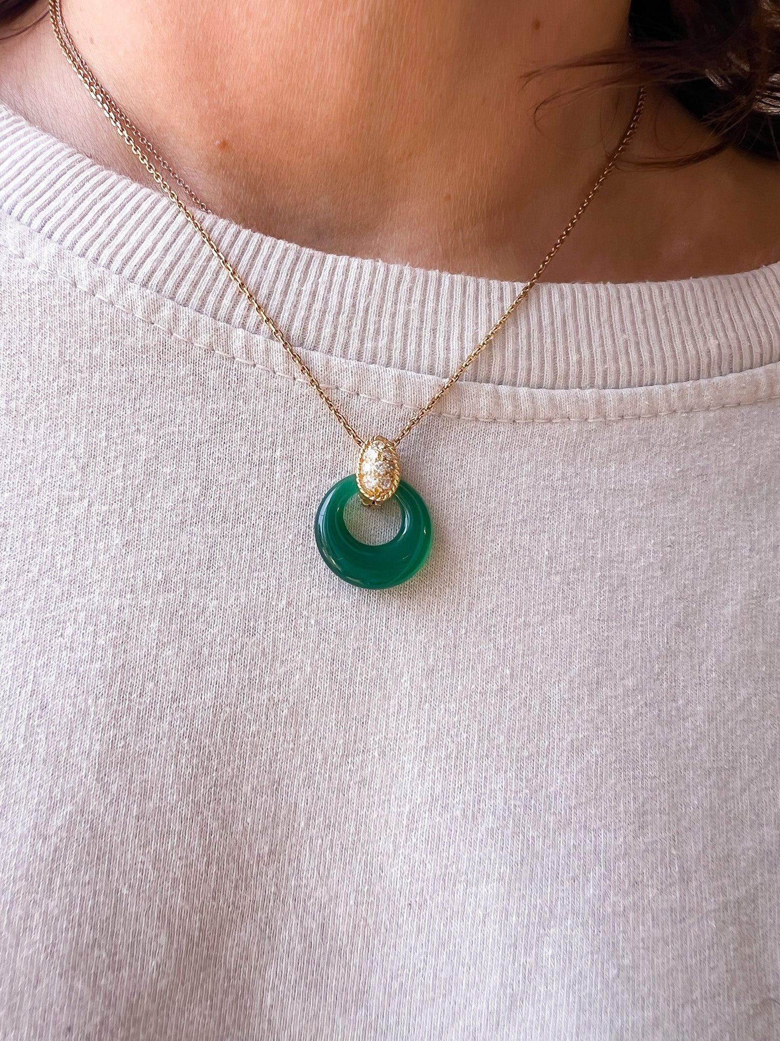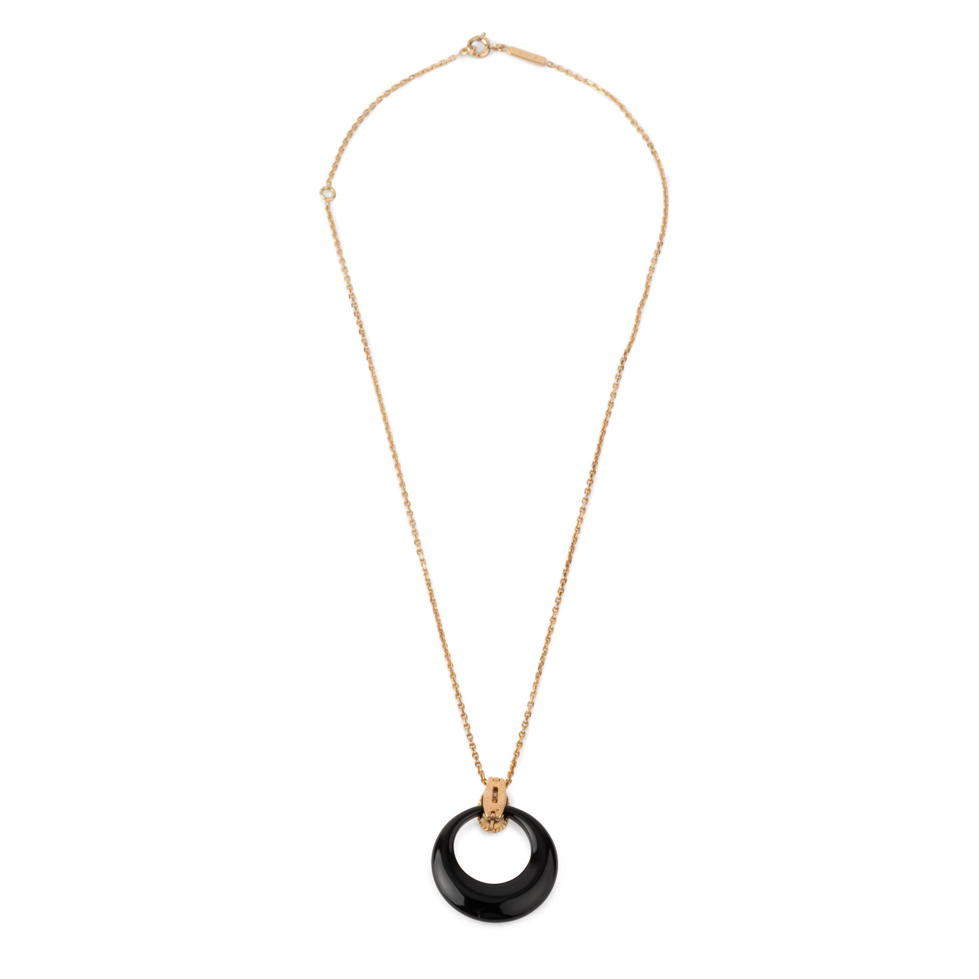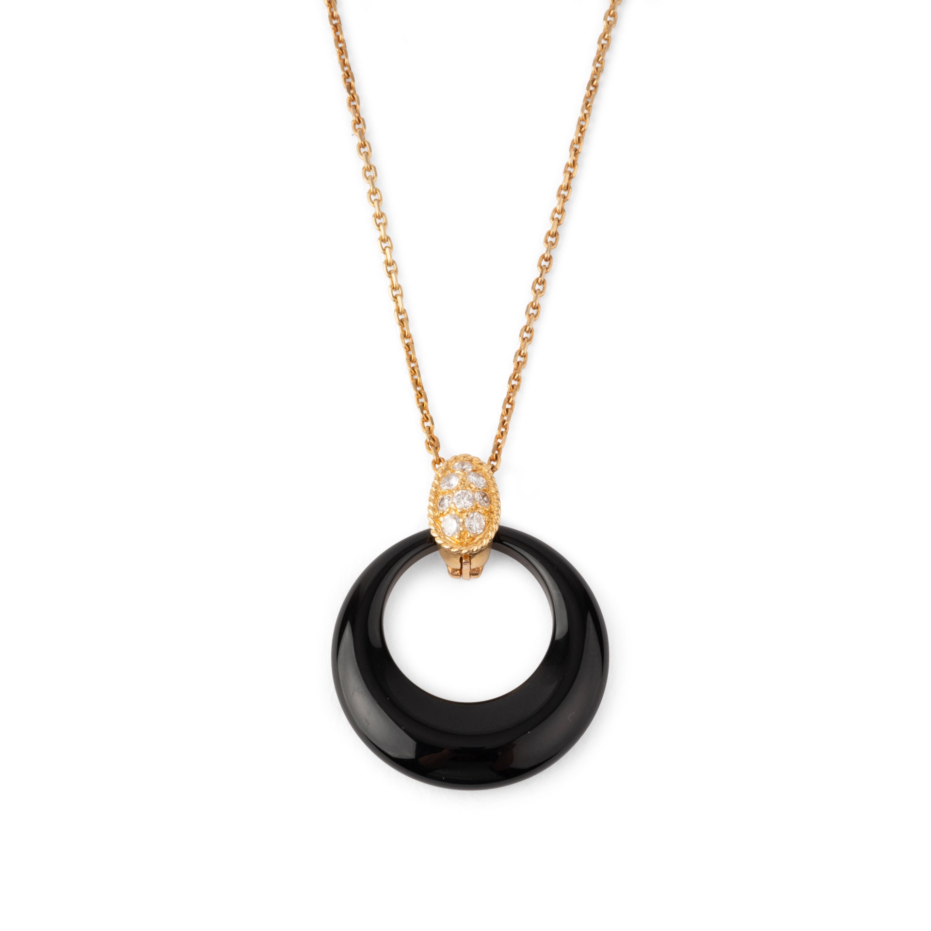 Le pendentif est composé d'une bélière en or jaune pavée de diamants retenant un anneau interchangeable, un anneau en chrysoprase et un anneau en onyx.